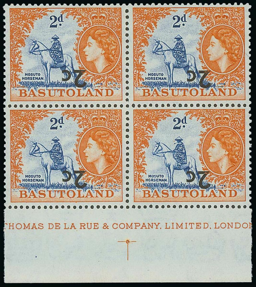 1961 2c. on 2d. deep bright blue and orange, a block of four with almost full imprint, variety surcharge inverted, fresh and fine unmounted mint. A very scarce multiple. R.P.S. Certificate (1999). S.G. 60a, £1200. Photo