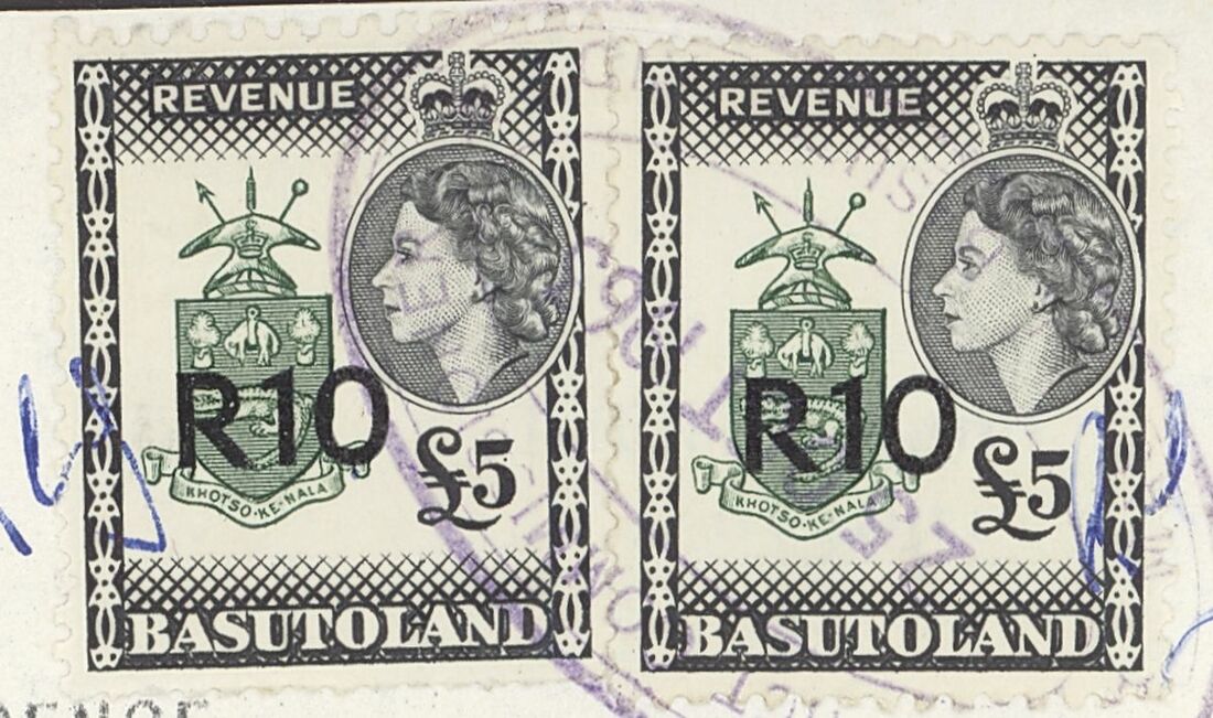 1961 R10 on £5 green and black pair tied by manuscript initials and cancelled by Maseru District Commissioner's Office oval datestamps in violet and affixed on 1963 Diamond Dealer's License
