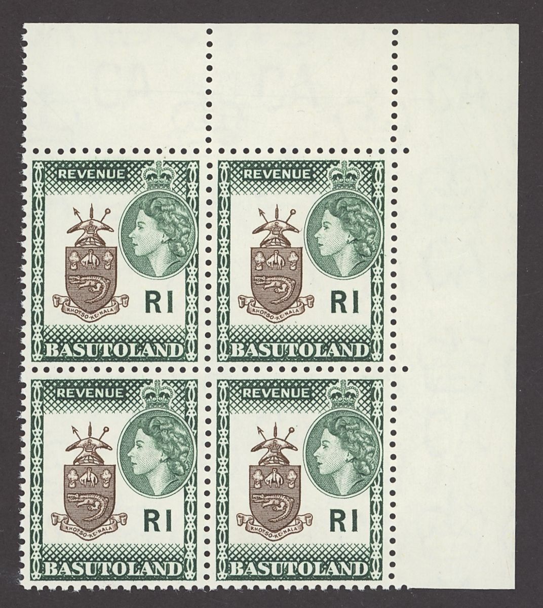 1961 New Currency R1 brown and green top right corner block of four, fine unmounted mint. Barefoot 87