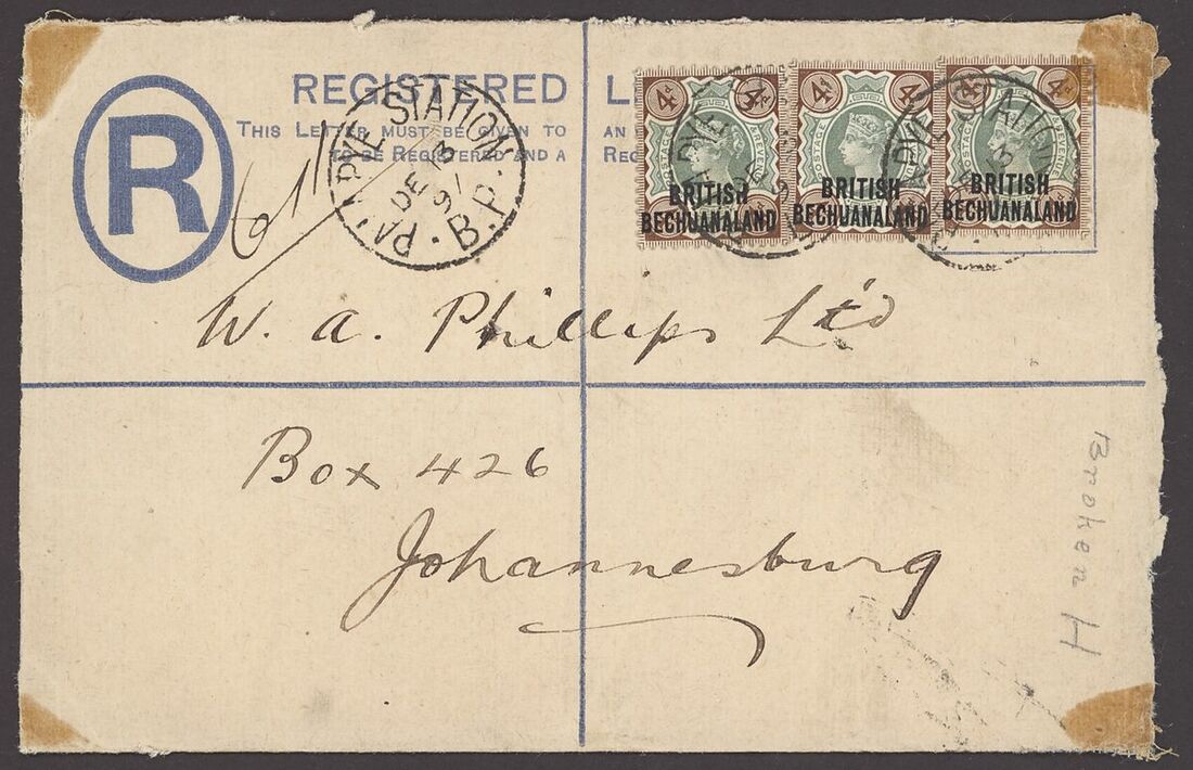 1897 (13 Dec.) envelope registered to Johannesburg, bearing 1891-1904 4d, green and purple (3) tied by two strikes of
