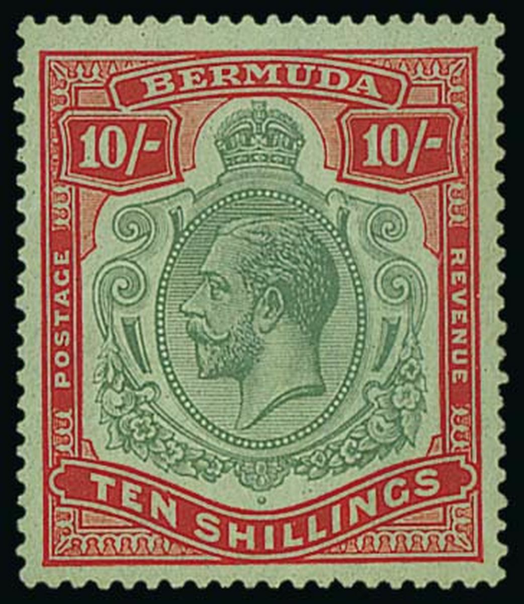 1924-32 Script 10/- green and red on pale yellow showing break in scroll, fine mint. S.G. 92b, £700. Photo