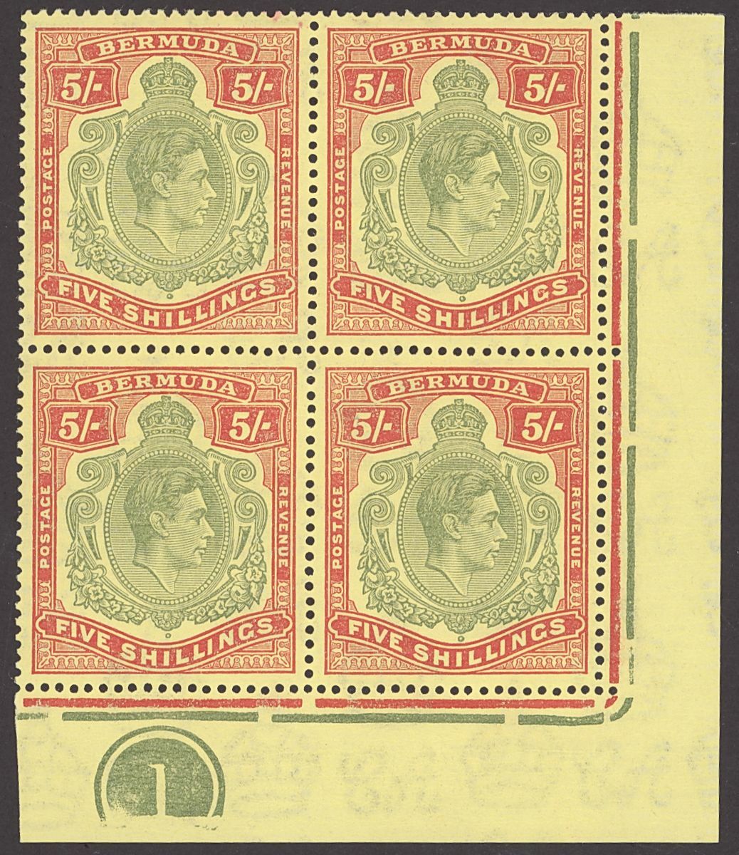 5/- yellowish green and pale red on pale yellow, perf. 14 block of four from the lower right corner of the sheet with plate number '1', and showing broken leaf and HPF 59b; unmounted mint, fine. S.G. 118f