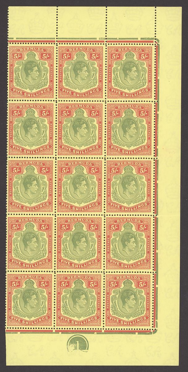 5/- green and scarlet on yellow, perf 13, chalk-surfaced paper, a block of fifteen from the right of the pane with plate number '1' at foot; full original gum, fine. S.G. 118g, £975+