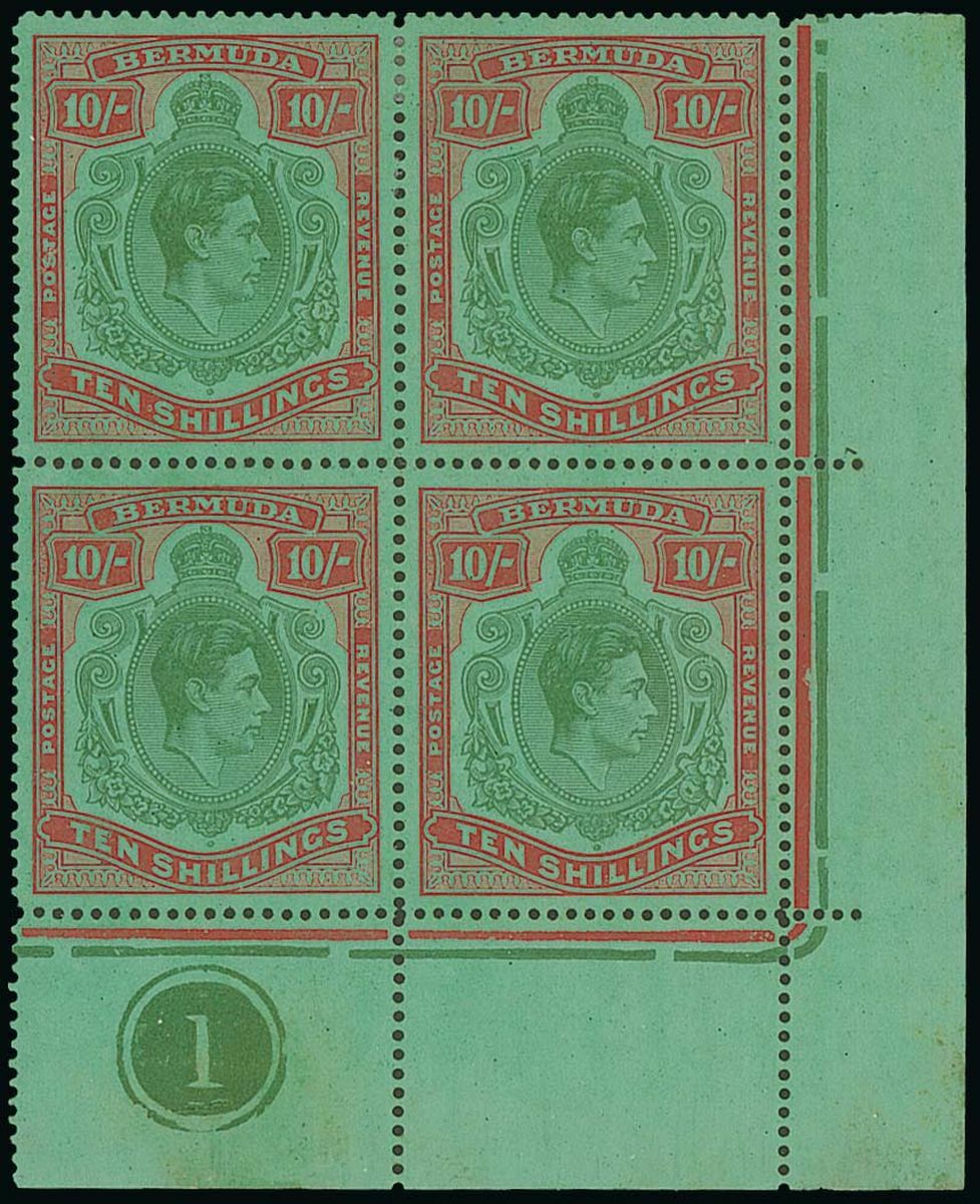 10/- yellow green and carmine on green, perf 14¼ line block of four from the lower right corner of the sheet with plate number '1' and showing broken top right scroll [5/11] and broken lower right scroll; some minor staining in the selvedge only, mounted on the upper pair only; fine and an attractive and rare positional piece. S.G. 119b/bd/be, £6,000+. Photo