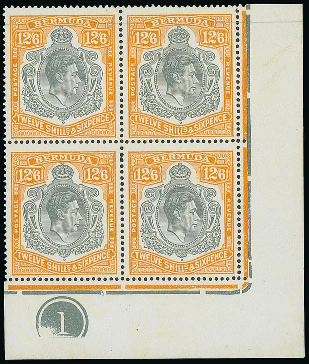 12/6d. deep grey and brownish orange, perf 14 block of four from the lower right corner of the sheet with plate number '1' showing broken lower right scroll [5/12]; some faint toning on the reverse, unmounted mint. S.G. 120c/ce, £2,610+. Photo