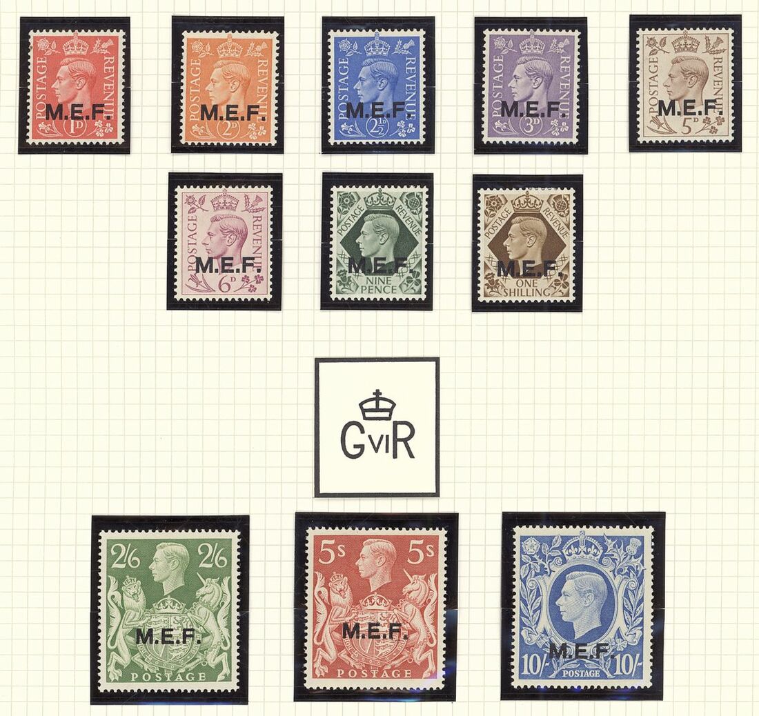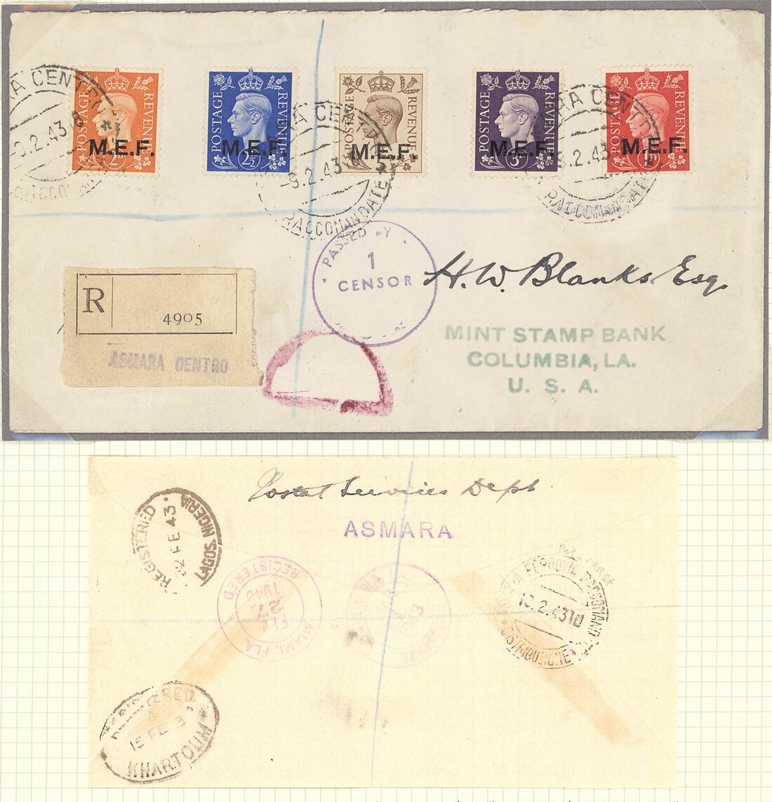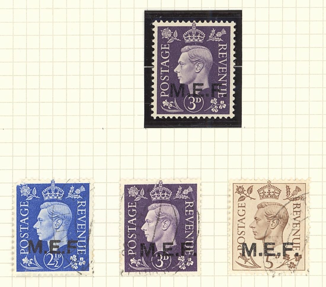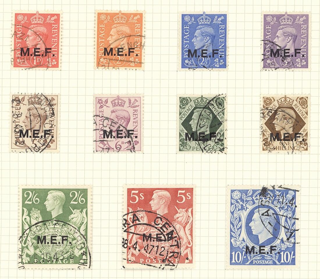 1942-47 mint and used group of Middle East Forces on album pages including mint and used sets, varieties and range of covers including 1d. used on first day of issue on envelope to Asmara, envelope from Mogadishu to Glasgow bearing 1d., 2d., 2½d., 3d. and 5d., used on first day of issue, envelope from Asmara to USA bearing 1d., 2d., 2½d., 3d. and 5d., active service envelope from Egypt to London bearing 1d., 2d., 2½d., 3d. and 5d., etc. A useful and good group