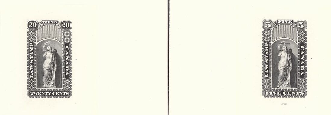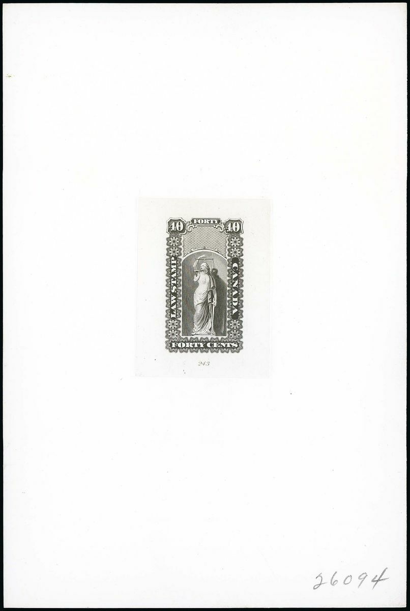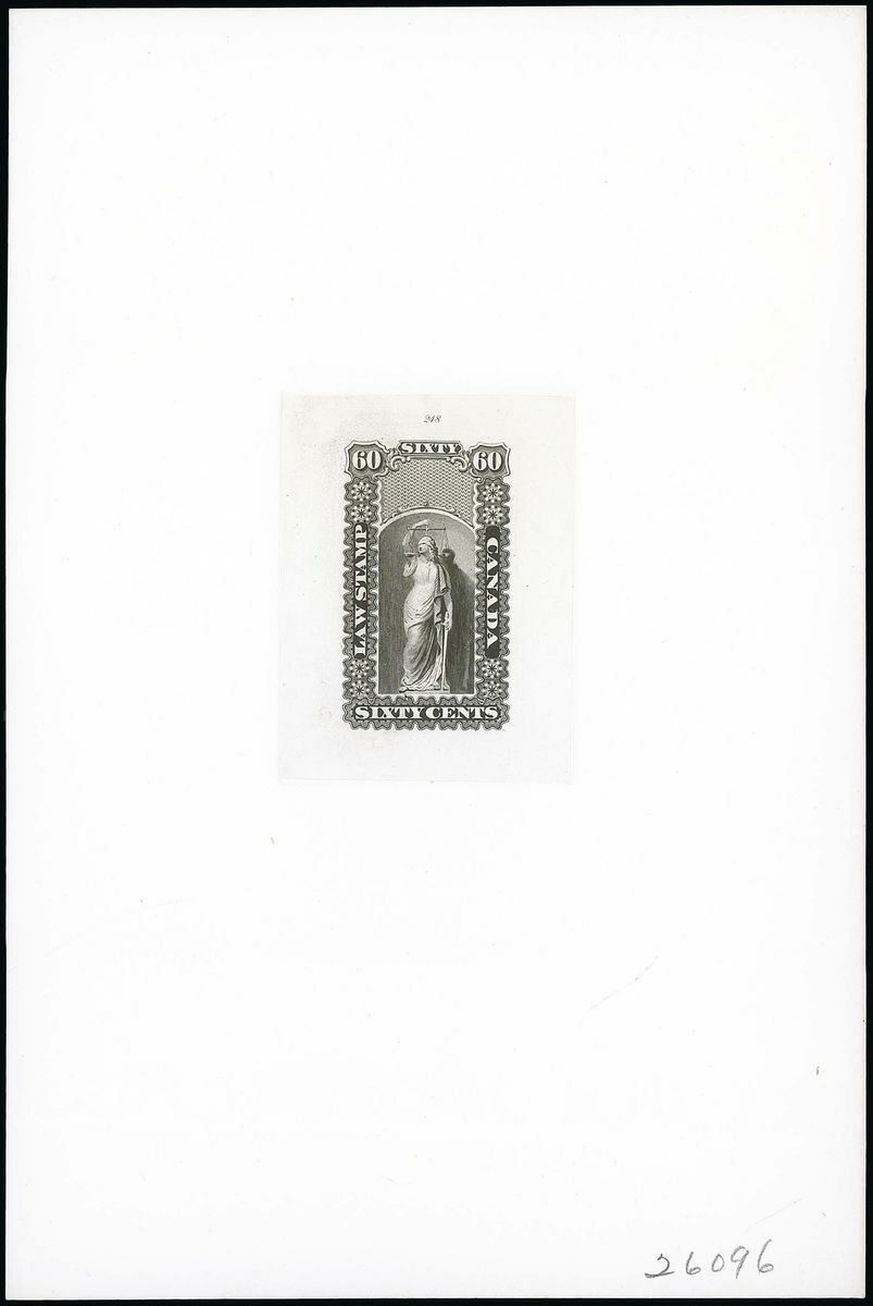 1864 Law Stamp die proofs, Justice design for 5c., 20c., 40c. and 60c., in black on India paper, die sunk on full size cards (152x226mm.) with die numbers "245" (5c.), "243" (40c.) and "248" (60c.) in pencil at lower right. A superb group. Photo