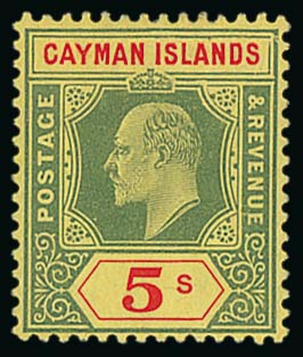 1907-09 MCA 5/- green and red on yellow showing variety damaged frame and crown, fine mint. Rare. S.G. 32a, £750. Photo