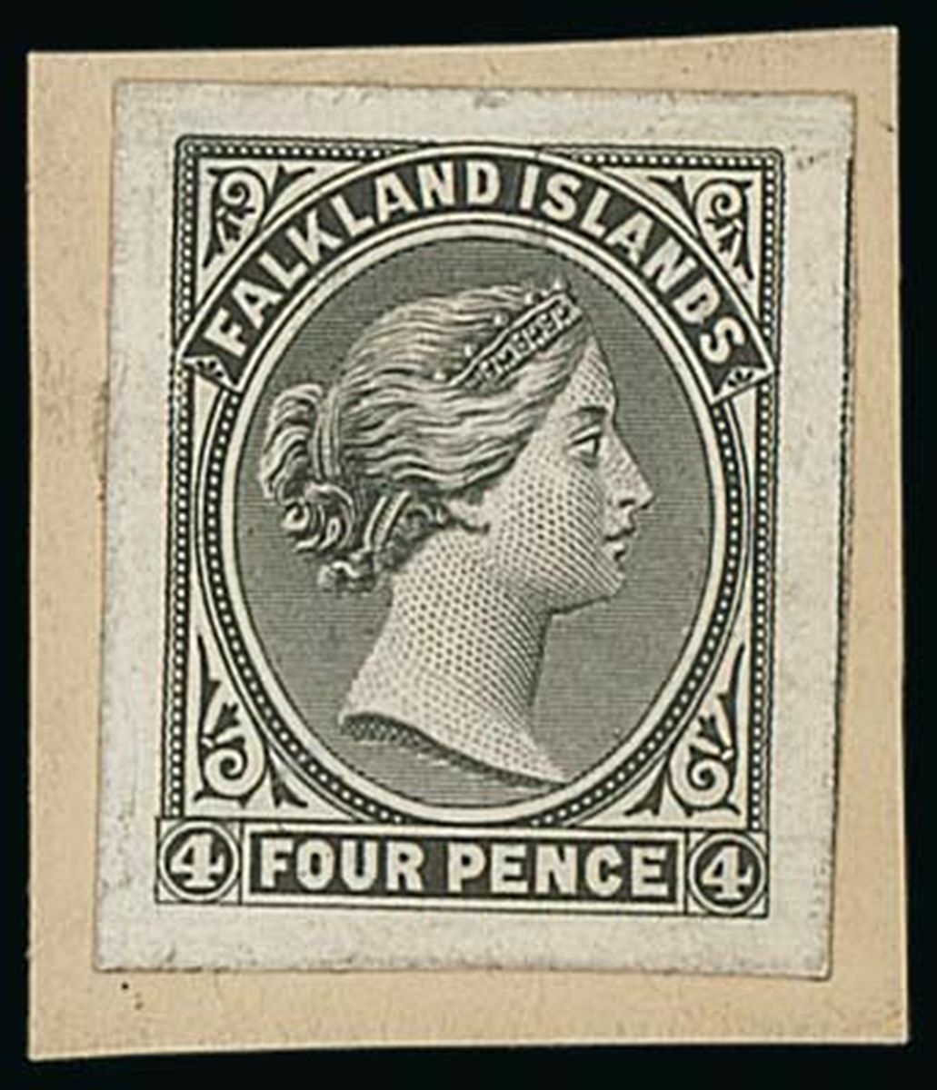 1878-79 Bradbury Wilkinson 4d. die proof with 1.5 to 2mm. margins, in black on thin card affixed to small piece (27x31mm.) with part of GB 5/- banknote proof printed on reverse. Extremely rare and unrecorded by Heijtz. Photo