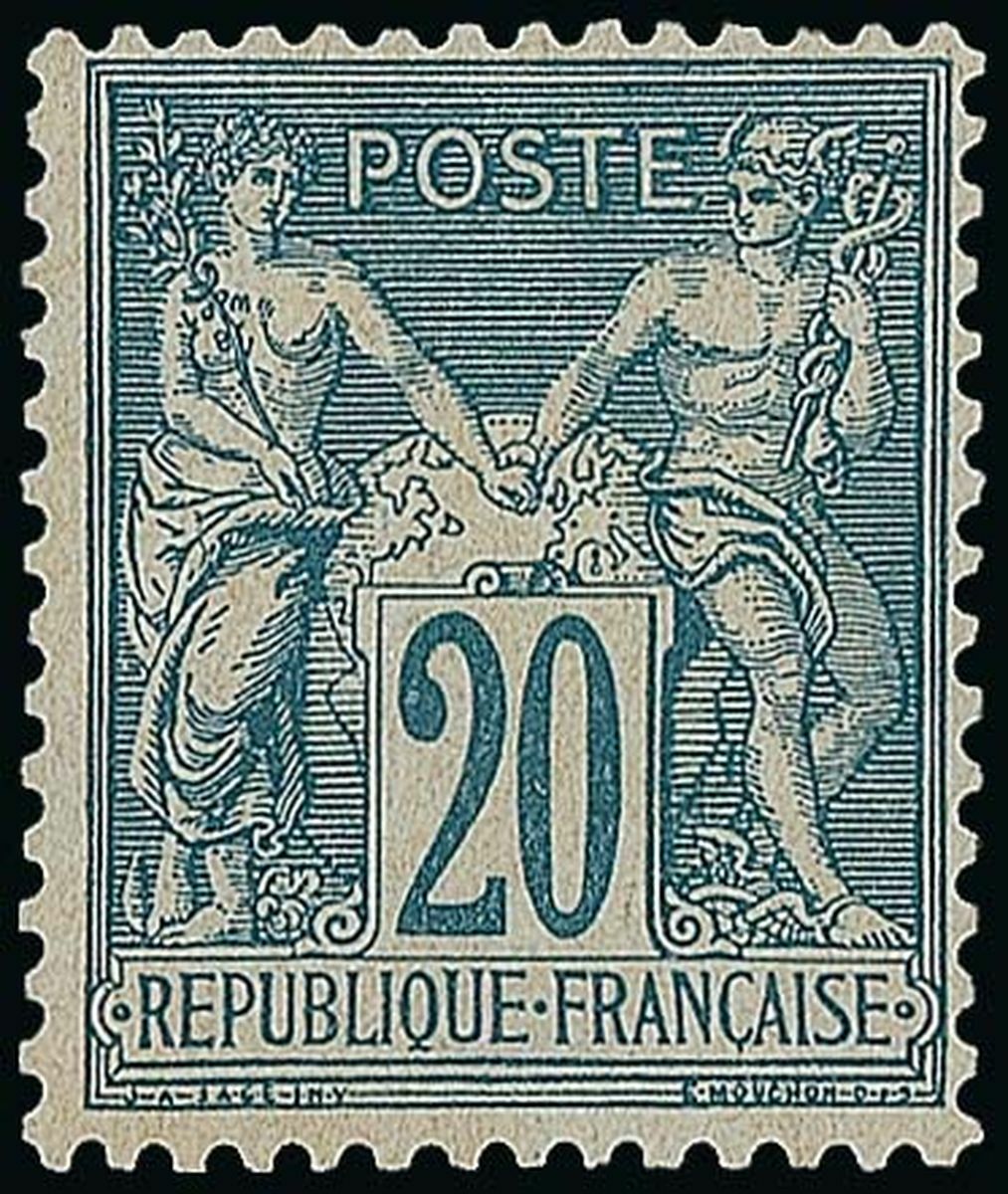 20c. blue, type I, 'N' under 'B', unissued, very attractively displaying a clear impression and intense shade, slightly centred to top -the few examples known of this stamp are found off centre-, good perforations, unmounted mint original gum. One of the rarest stamps of French philately and the rarest one of the "Sage" issues, this being a very fine example and possibly the best one of the few recorded. Old signatures on reverse and R.P.S. Certificate (2020). Spink Maury 73, €50,000. Photo