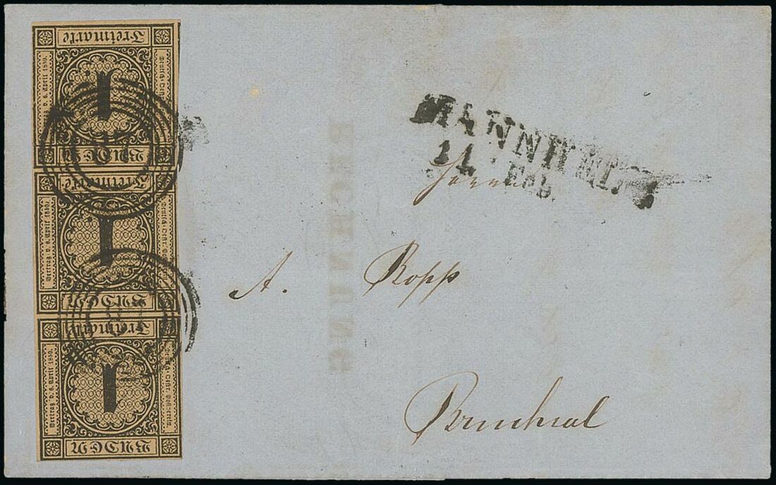 1851-52 1k. black on brown vertical strip of three, good to large margins all round and showing a portion of the adjoining stamp at left, applied upside down on entire letter dated Feb. 14 1853 to Bruschal, "87" in concentric circles cancellations of Mannheimm; fine and rare. M. Brettl Certificate (1994) stating "Ein exzellenter Brief". Photo