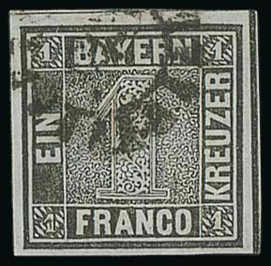 1849 1k. black, Plate 2, large margins with partial dividing lines on three sides, "243" cog wheel cancellation of Nurnberg, diagonal crease at lower right, fine. M. Brettl Certificate (2001). Michel 1 IIa. Photo