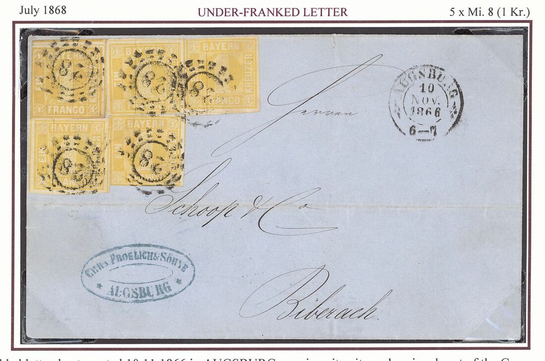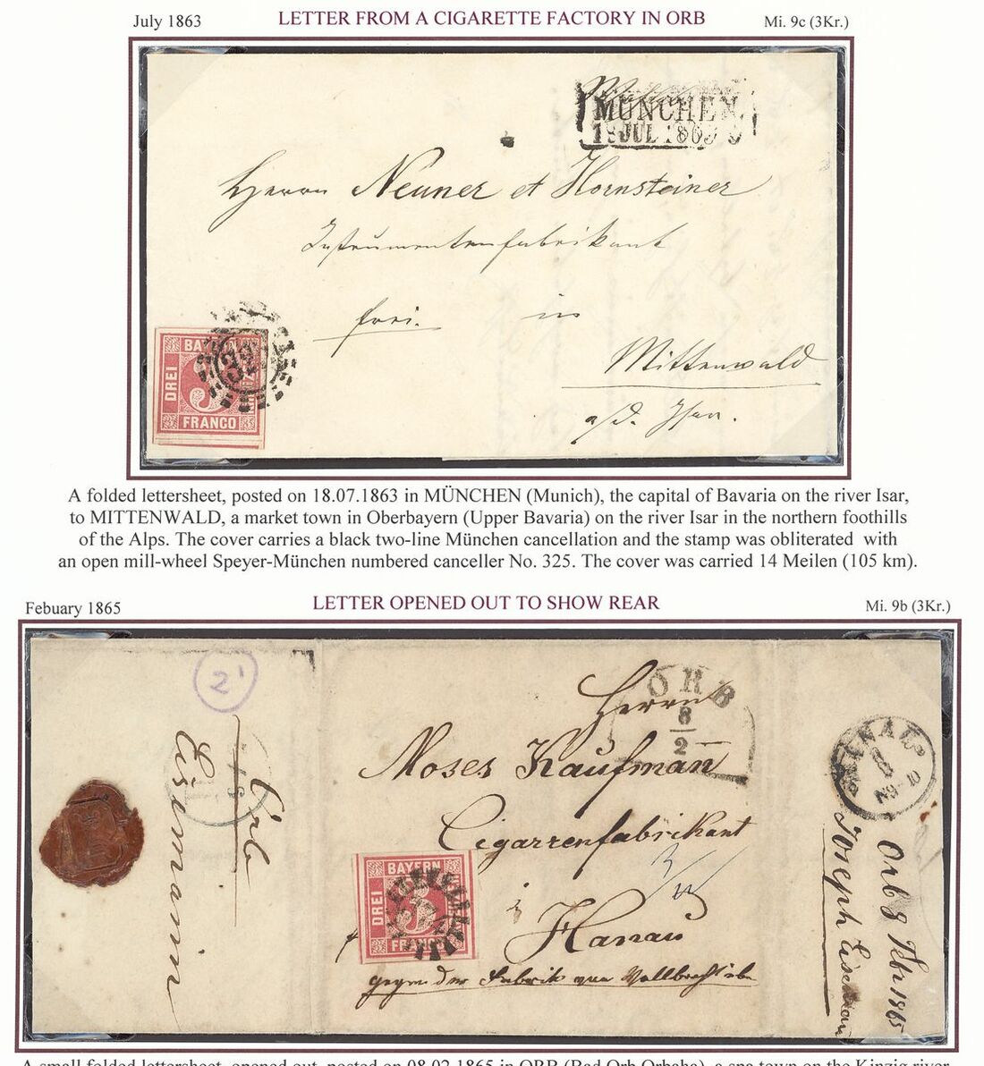1862-63 changed colours, collection, eleven stamps and three covers, including 1k. with a pair and three singles on cover from Ausburg to Biberach, 6k. part original gum, 9k. with 1867-69 6k. on entire from Starnberg to Bern (Van Der Linden Certificate 2000), 12k., 18k. (2), etc., chiefly good to fine