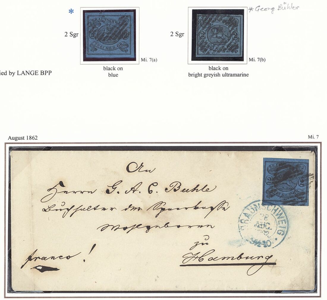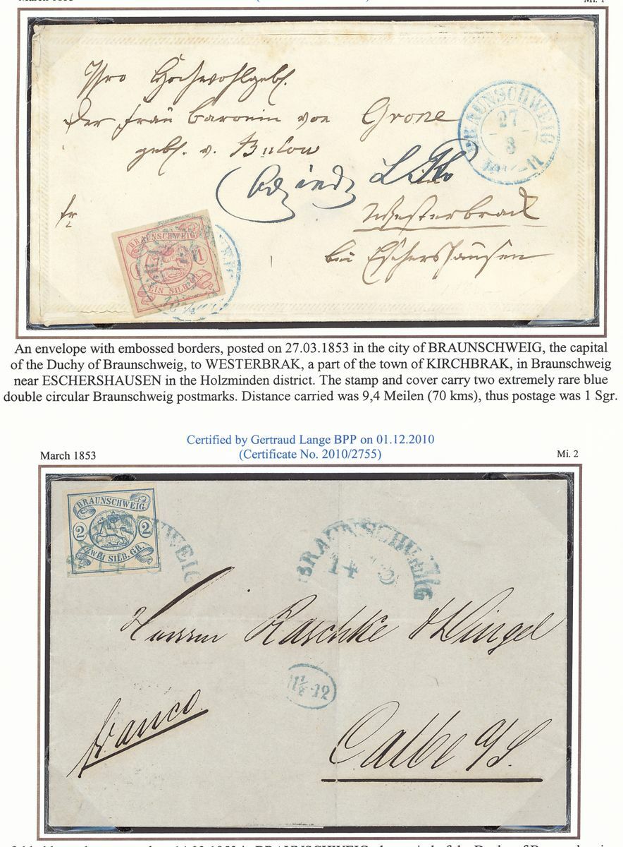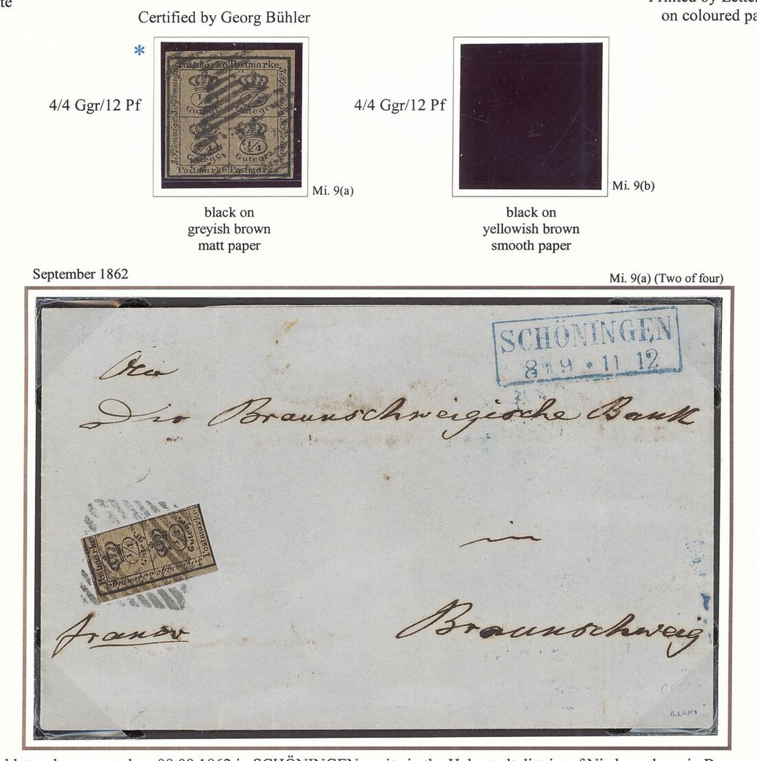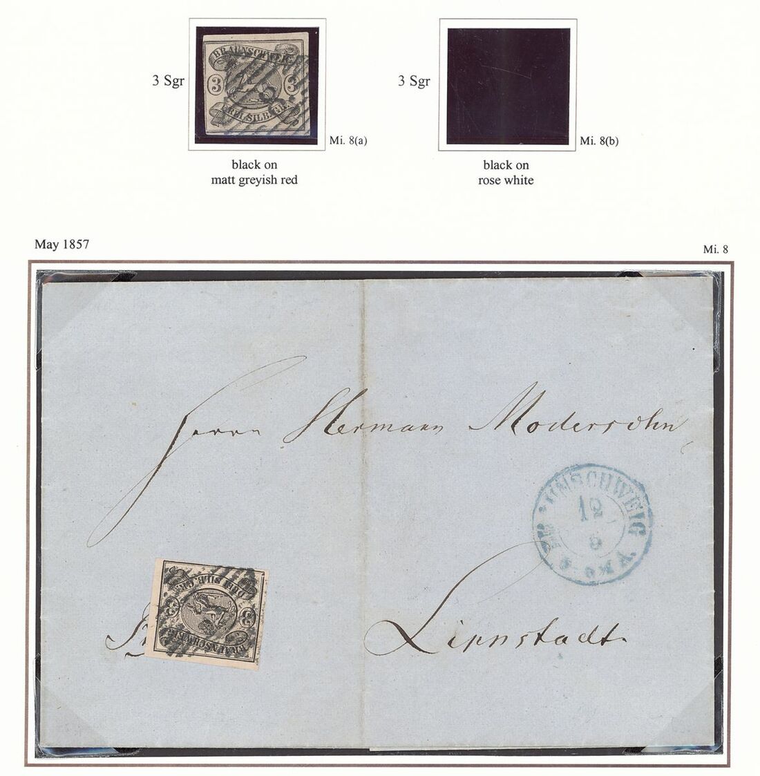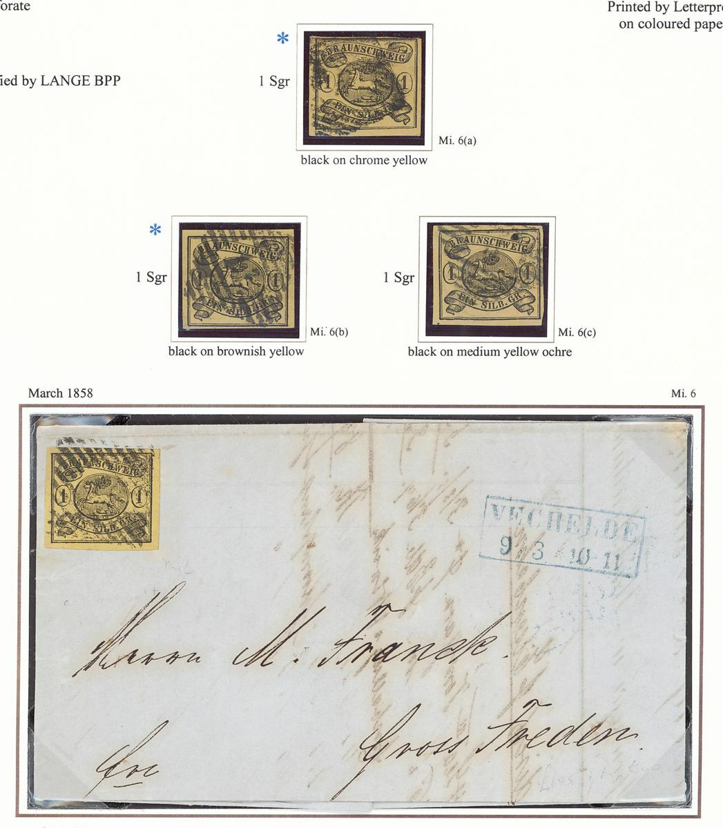 A selection comprising 1852 1sgr. on embossed lady's envelope, 2sgr. on entire to Calbe (each with Lange certificate 2010), 1853 1sgr. (3 and another on entire), 2sgr. (2 and another on entire), 3sgr. (single and another on entire), 1857 4/4ggr., entire franked vertical pair ¼ggr., chiefly fine