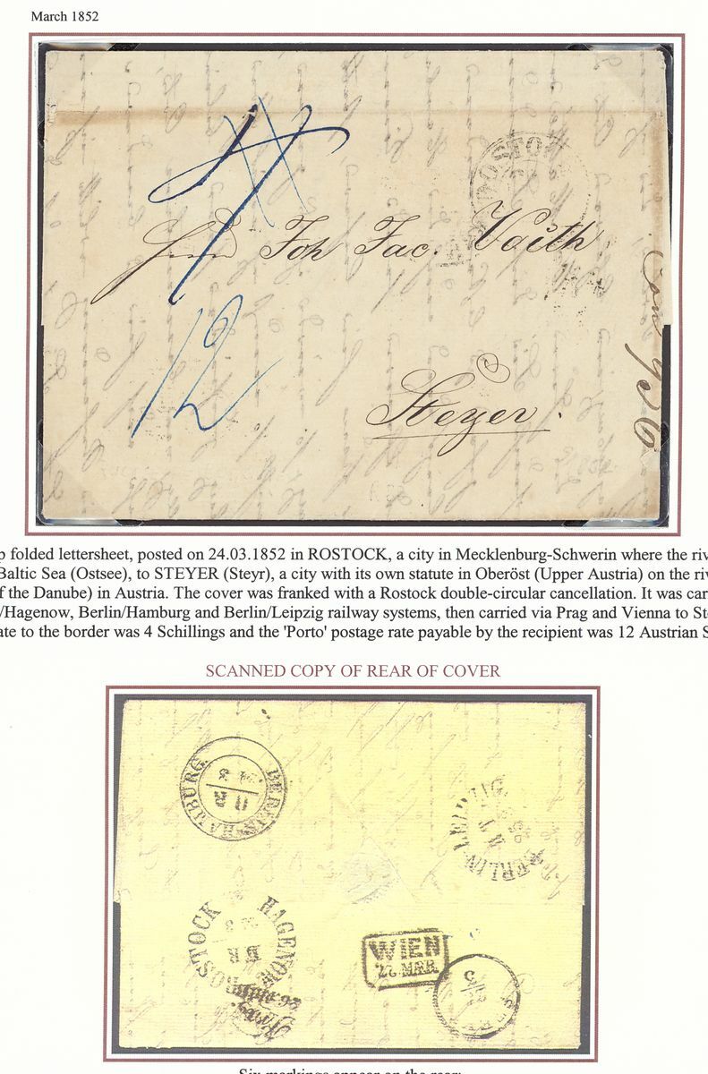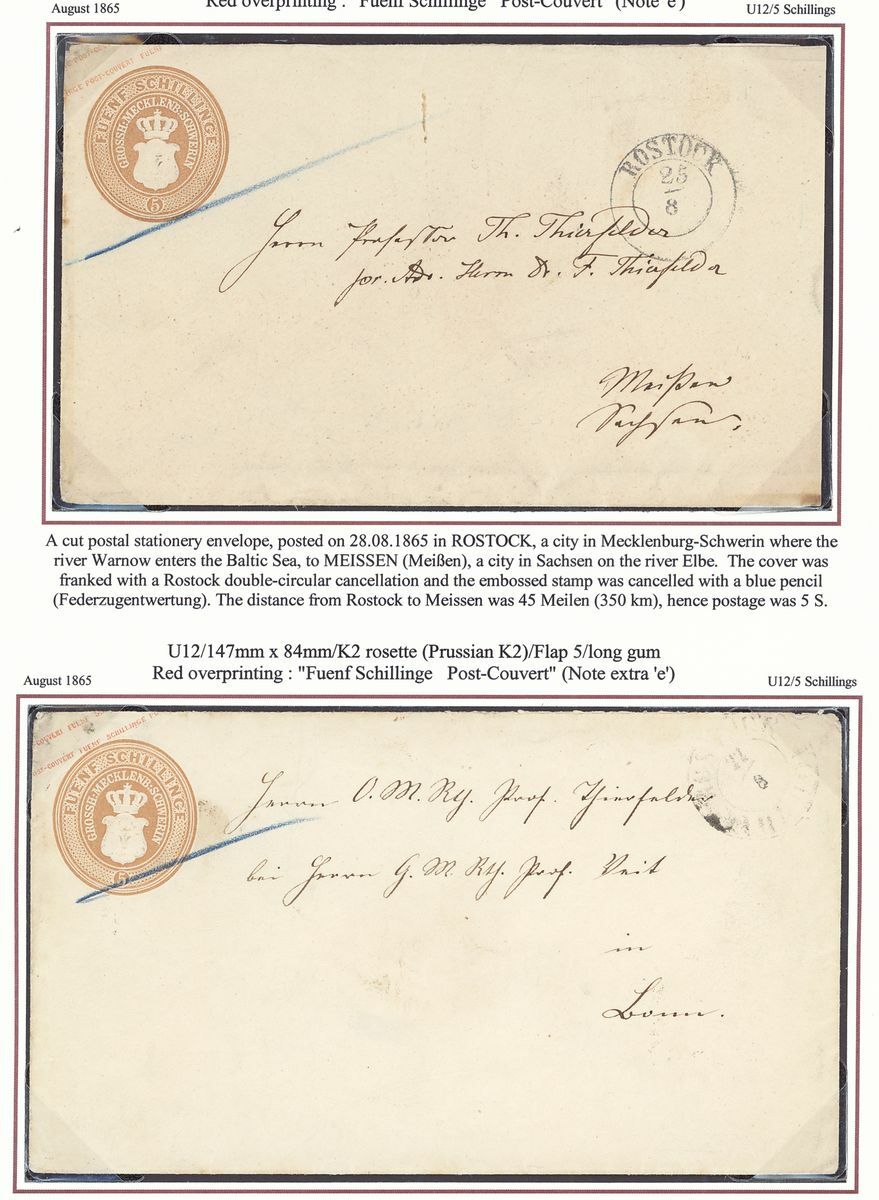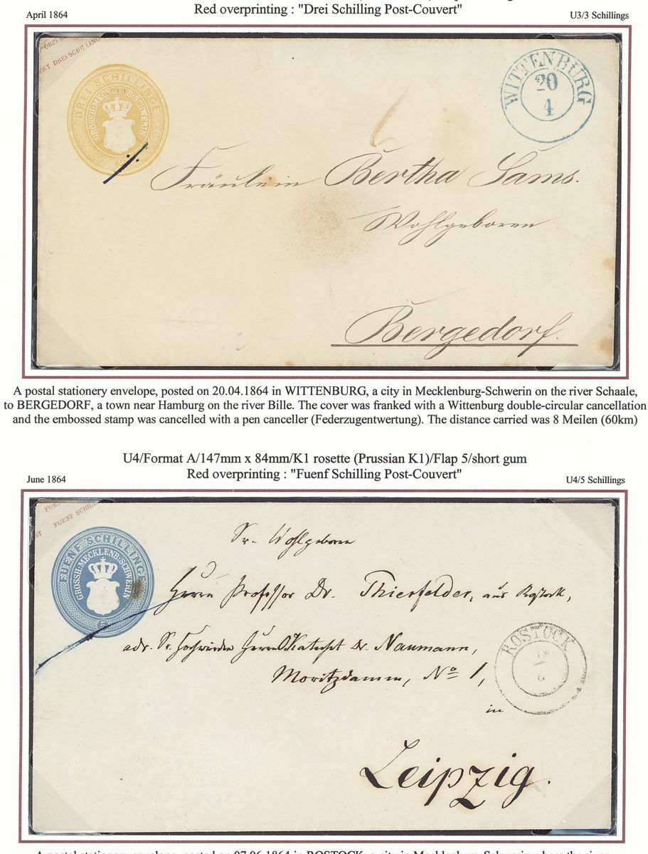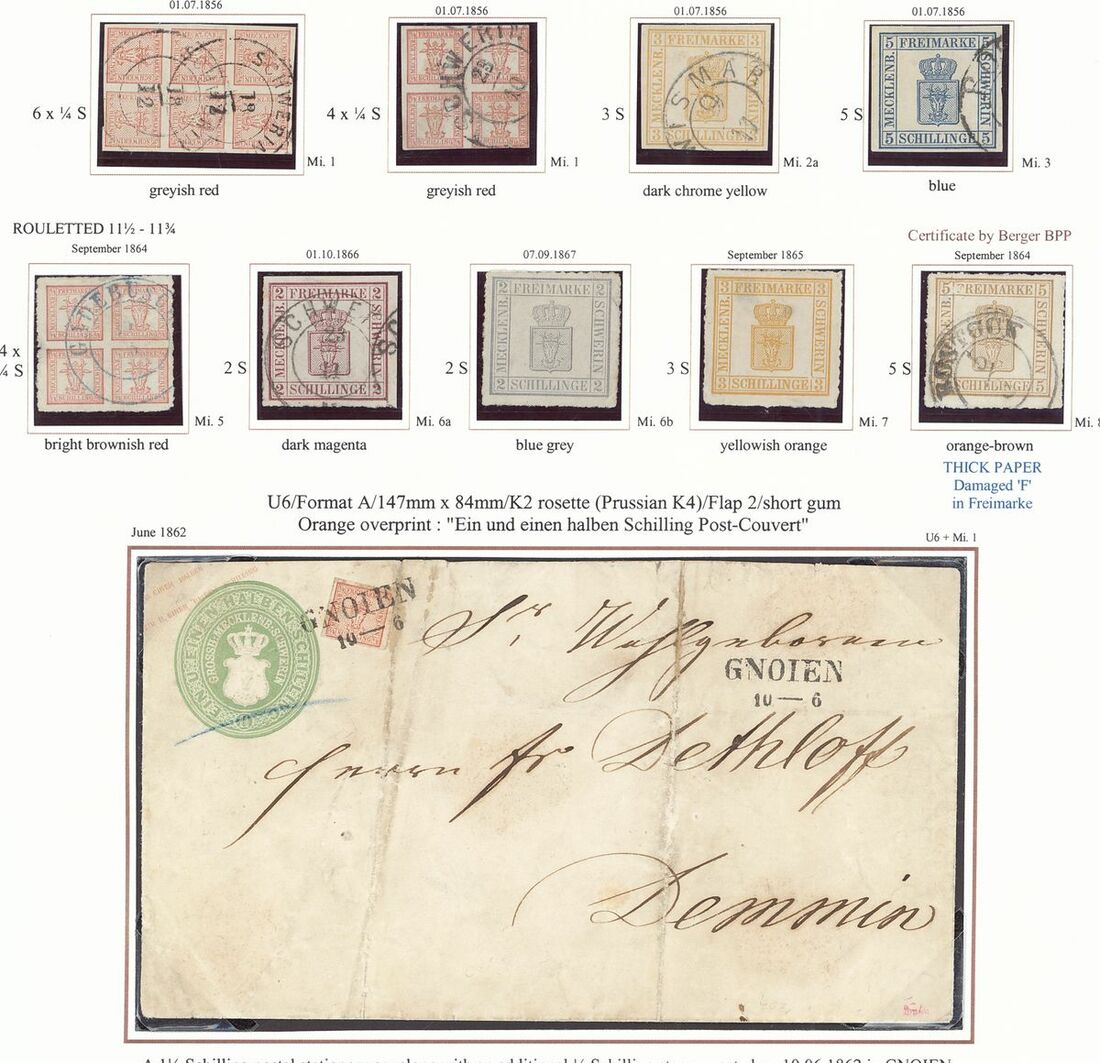 A selection (9 stamps and nine covers), well written up on pages, including 1856 ½s. block of six, single used on 1½s. postal stationery envelope used from Gnoien to Demmin, 3s., 5s., 1864 dotted background 4/4s., 5s., 1865-67 3s. and another on cover from Malchin to Rostock, Postal stationery with 1½s., 2s. and 5s. blue and 5s. brown (2) envelopes used, etc., mixed condition