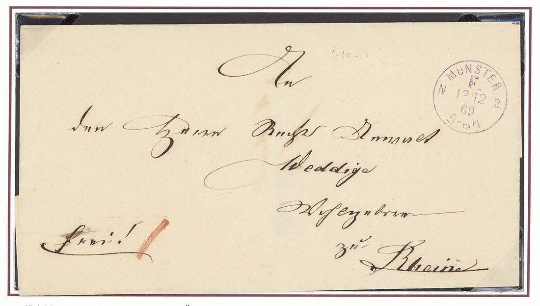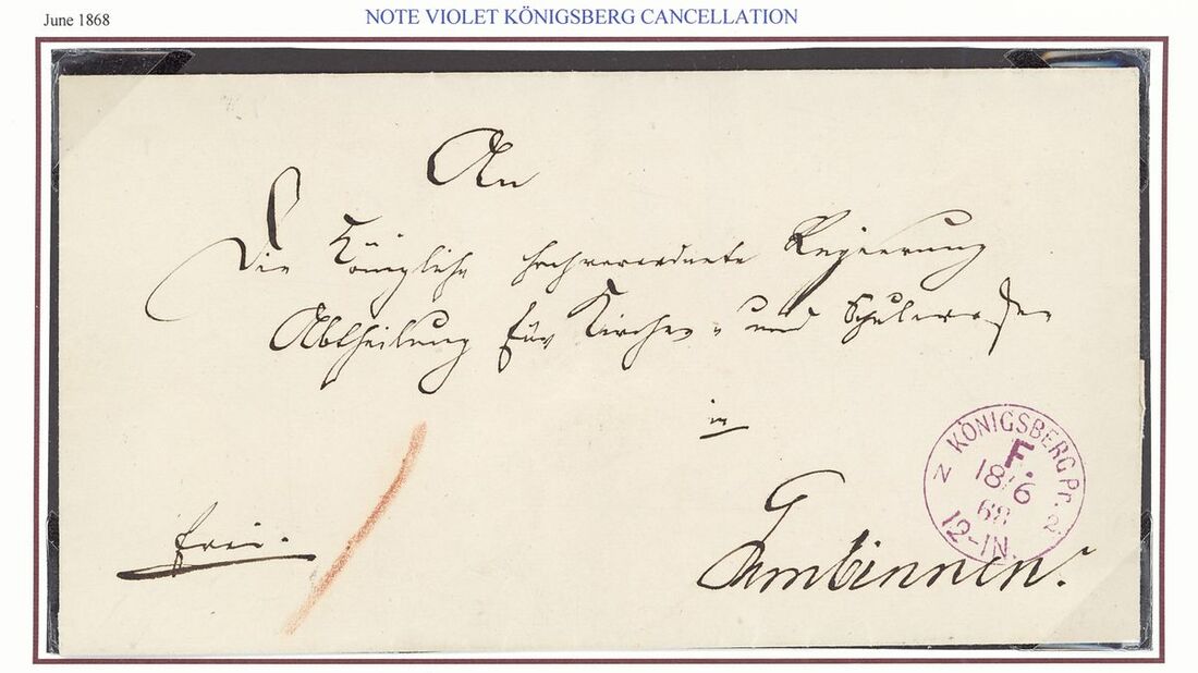 1868 (June) entire to Gumbingen with violet Konigsberg c.d.s., 1869 (Dec.), entire to Rhine with violet Munster c.d.s., charged 1g., 1871 (Mar.) entire to Framersheim with Mainz c.d.s., fine. Three scarce stampless Official letters, also 1871 Hamburg ½s. postal stationery envelope, used as a letter accompanying a parcel from Hamburg to Keil (signed Mehlmann), fine