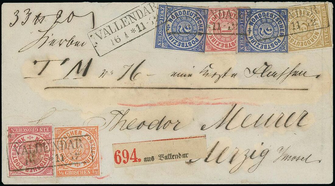 1868 (16 Jan.), envelope registered to Ürzig bearing ½g., 1g. (2), 2g. (2) and 5g., framed Vallandar cancellations; a little water stained and flap on reverse with some faults. An attractive and rare four colour 11½g. franking. Michel 3,4,5,6. Photo