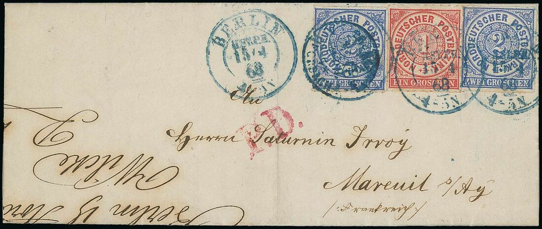1868 (15 Apr.) entire letter to Mareuil, bearing 1g., 2g. (2) with Blue Berlin cancellations and magenta "PD." on the front, Paris a Givet entry and arrival datestamp on reverse; vertical filing fold, well clear of the adhesives and some manuscript notes on the front; fine. Michel 4, 5. Photo