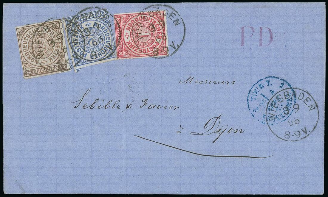 1868 (3 Sept.) entire to Dijon bearing 1g., 2g. and 5g., Wiesbaden cancellations and with purple "PD" alongside, blue Tour T/Erquelines entry datestamp on front and arrival c.d.s. on reverse; fine. A rare and attractive three colour franking. Michel 3, 4, 5. Photo