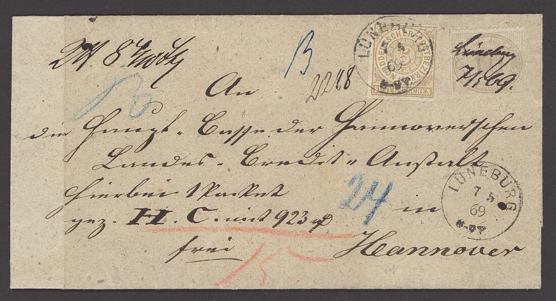 1869 (7 May) "Wertbrief" to Hannover, bearing 5g. bistre with Lüneberg cancellation and 1869 10g. grey (faults on application) with manuscript cancellation, arrival datestamp on reverse; scarce. Michel 6, 25. Photo