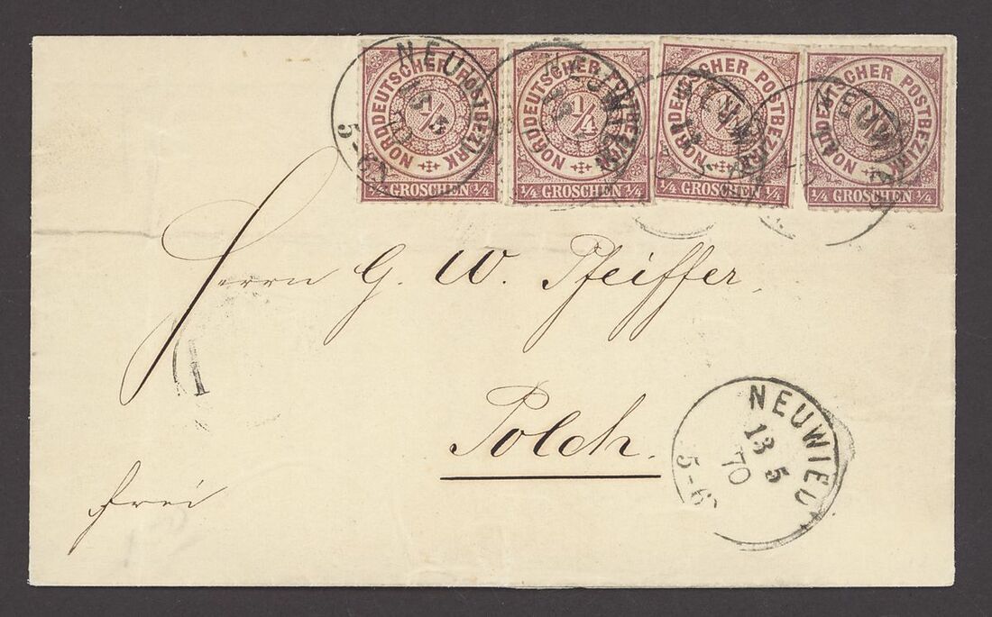 1870 (13 May) entire letter to Polch bearing ¼g. purple (4, one with small corner fault) with Neuried cancellations, arrival on reverse; filing fold clear of the adhesives, fine. Michel 1