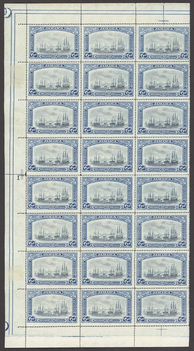 1921-29 Script 6d. black and blue block of twenty-four (3x8) from the left of the sheet with margins on three sides showing plate number "1", some horizontal folds along perforations, fresh unmounted mint. S.G. 101, £408