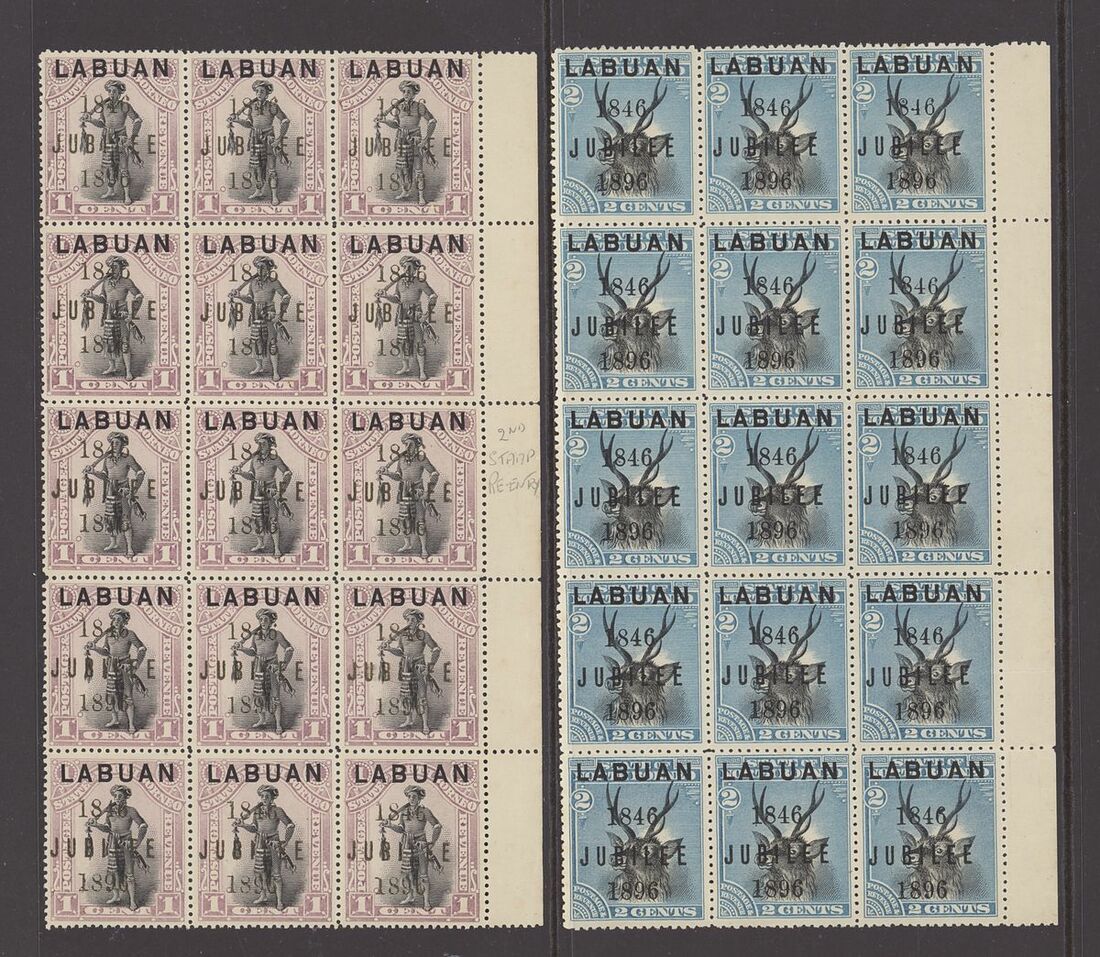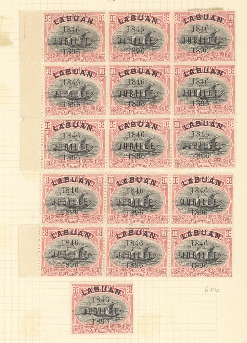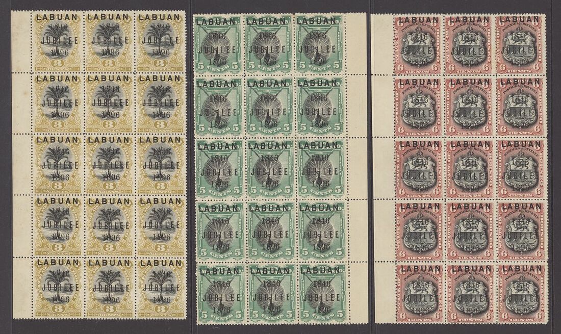 1896 (Sept.) Jubilee 1c. to 8c. in mint blocks of nine (3x4), one 2c. row with horizontal crease and the 8c. in blocks of nine and six, otherwise fine. S.G. 83-88, £2,250
