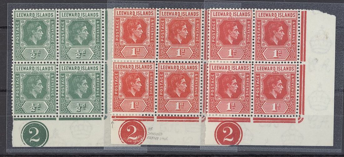 ½d. emerald, 1d. scarlet and 1d. carmine, each in a lower right corner block of four with plate no. 2 and each showing variety serrated edge, fine unmounted mint. S.G. 96/b, 99/b, 99/ca, £530