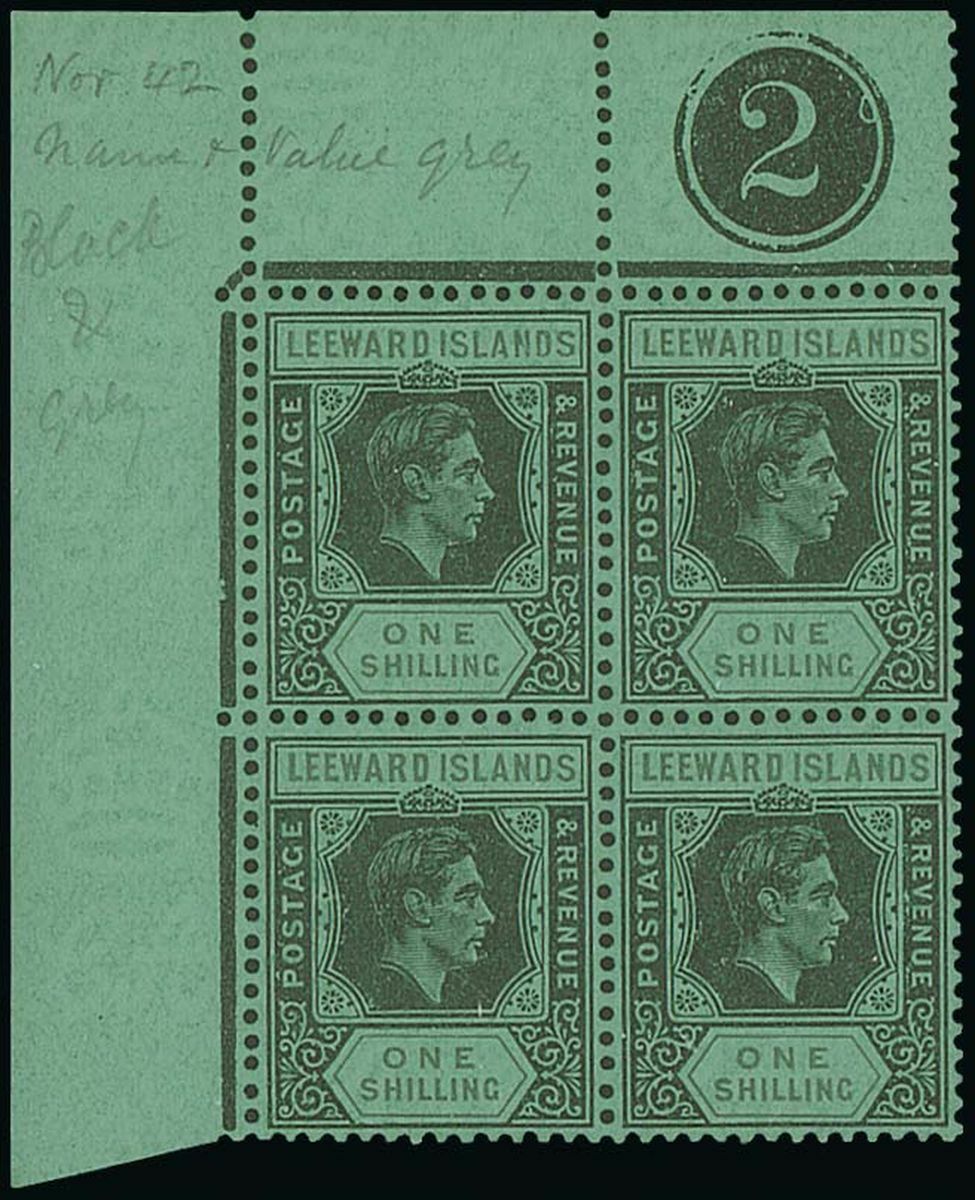 1/- black and grey on emerald, a top left corner block of four with plate no. 2 showing distinctive "curl" in the plate plug, fine unmounted mint. S.G. 110bb, £520+. Photo