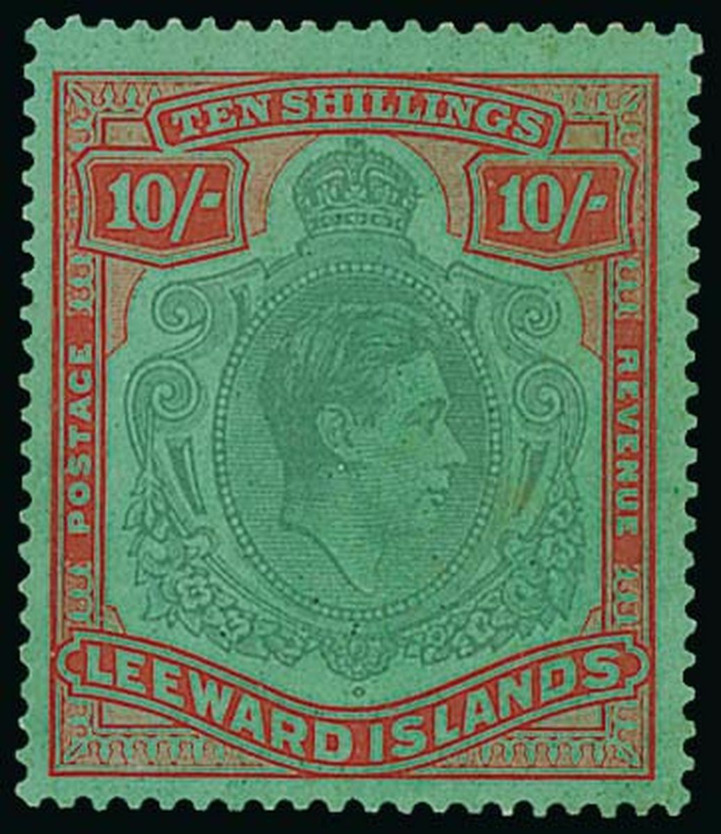 10/- pale green and dull red on green, ordinary paper, showing broken top right scroll, fine unmounted mint. Very rare. S.G. 113ad, £8,000. Photo