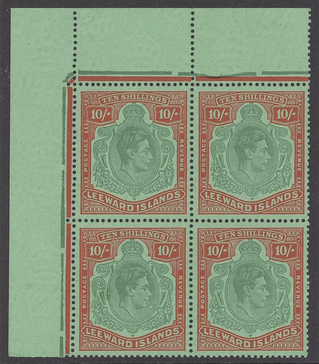 10/- pale green and dull red on bright emerald (Fourth printing, June 1944), a top left corner block of four, hinged in the selvedge, fresh and fine unmounted mint