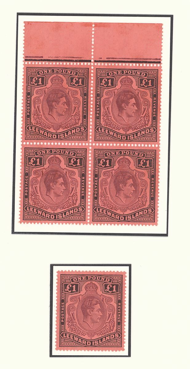 £1 purple and black on red marginal block of four [9-10/21-22] from the February 1942 printing and a single from the October 1942 printing, both showing HPF 21a, and £1 violet and black on scarlet, perf 13, lower right corner block of four with plate no. 1; fine mint