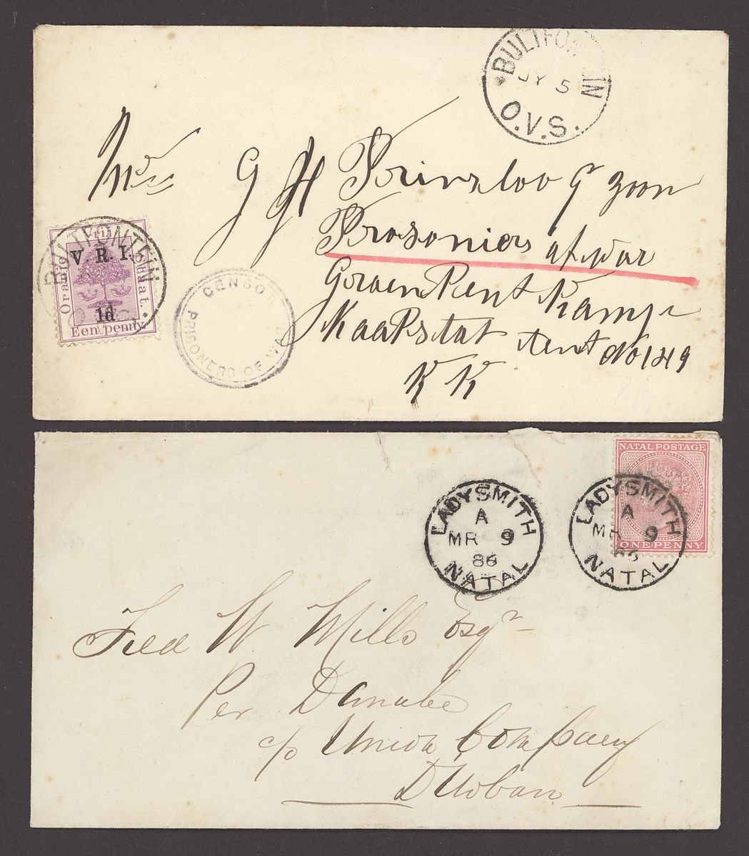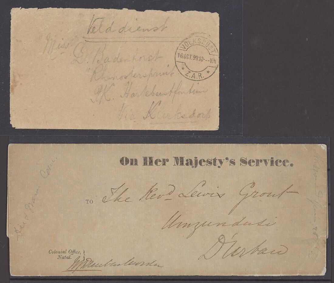 1863 O.H.M.S. outer wrapper with pre-printed 'Colonial Office/ Natal' at lower left and addressed to Rev. Lewis Grout, 1886 (9 Mar.) envelope to Durban 'Per Dundee' bearing 1d. tied by