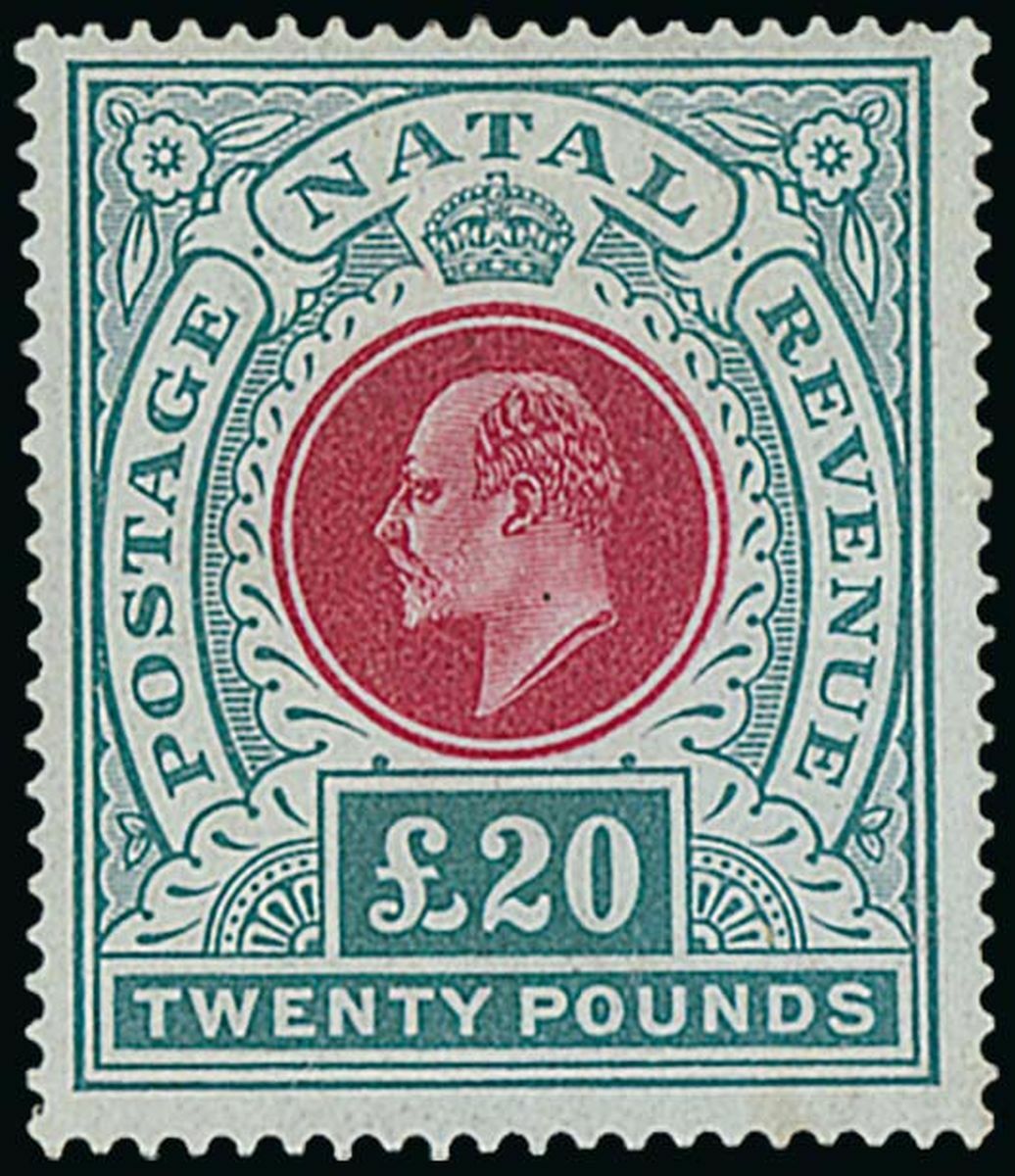 1902 CC "Postage Revenue" £20 red and green; a superb example of this rare high value with large part original gum, Signed A. Diena and with his Certificate (1955) and Brandon Certificate (2012). S.G. 145b, £35,000. Photo