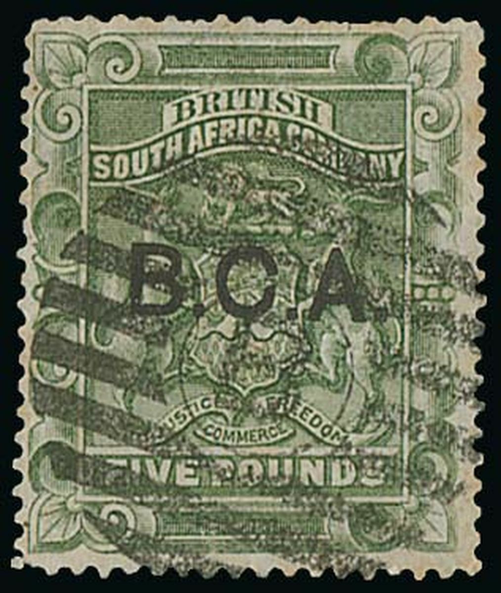 £5 sage-green, cancelled by clear "B" in circle of bars, fine. S.G. 16, £2,500. Photo