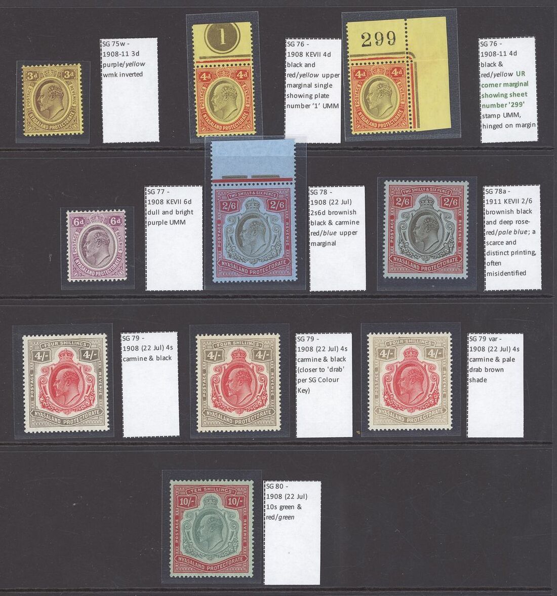3d. with watermark inverted, 4d. (2, both marginal, one with plate number, the other with sheet number), 6d, 2/6d. (2, one brownish black and deep rose-red on blue), 4/- (3) and 10/-, fine mint. Cat. £1,400+