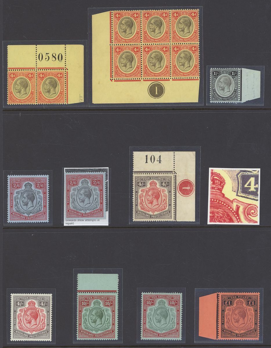 4d. top right corner pair with sheet number and lower left corner block of six with plate number, 1/- black on blue-green (marginal) with watermark inverted, 2/6d. (2, one with nick in top right scroll), 4/- (2, one a top right corner example with plate and sheet numbers), 10/- pale green and deep scarlet on green, 10/- green and deep scarlet on green (marginal) and £1 (marginal), fine mint. Cat. £1,000+