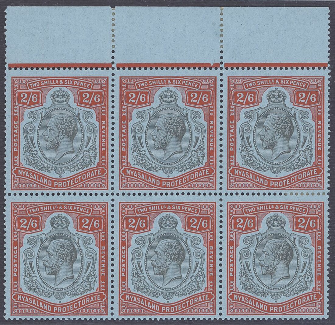 2/6d. grey-black and scarlet-vermilion on pale blue, a block of six (3x2) with margin at top, the odd split perf otherwise fine mint. S.G. 110j, £300