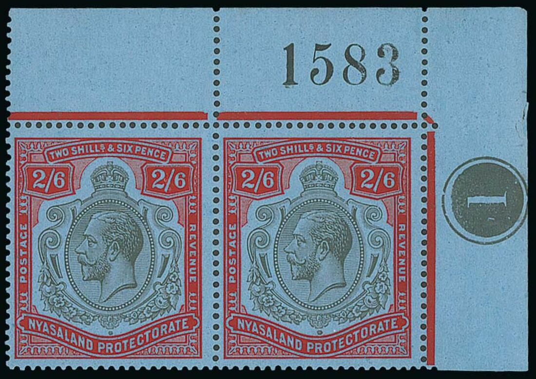 2/6d. grey-black and scarlet vermilion on pale blue, a top right corner pair with plate and sheet numbers, the right stamp showing break in scroll, mounted in the selvedge, fine unmounted mint. S.G. 110j/jb, £450. Photo