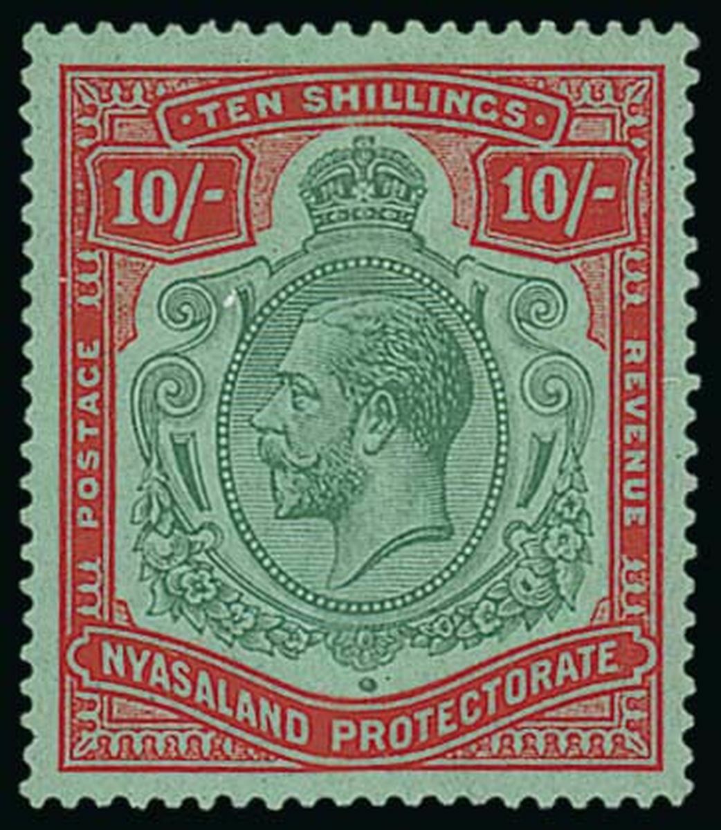 10/- green and red on pale emerald showing nick in top right scroll, fine mint. S.G. 113c, £600. Photo