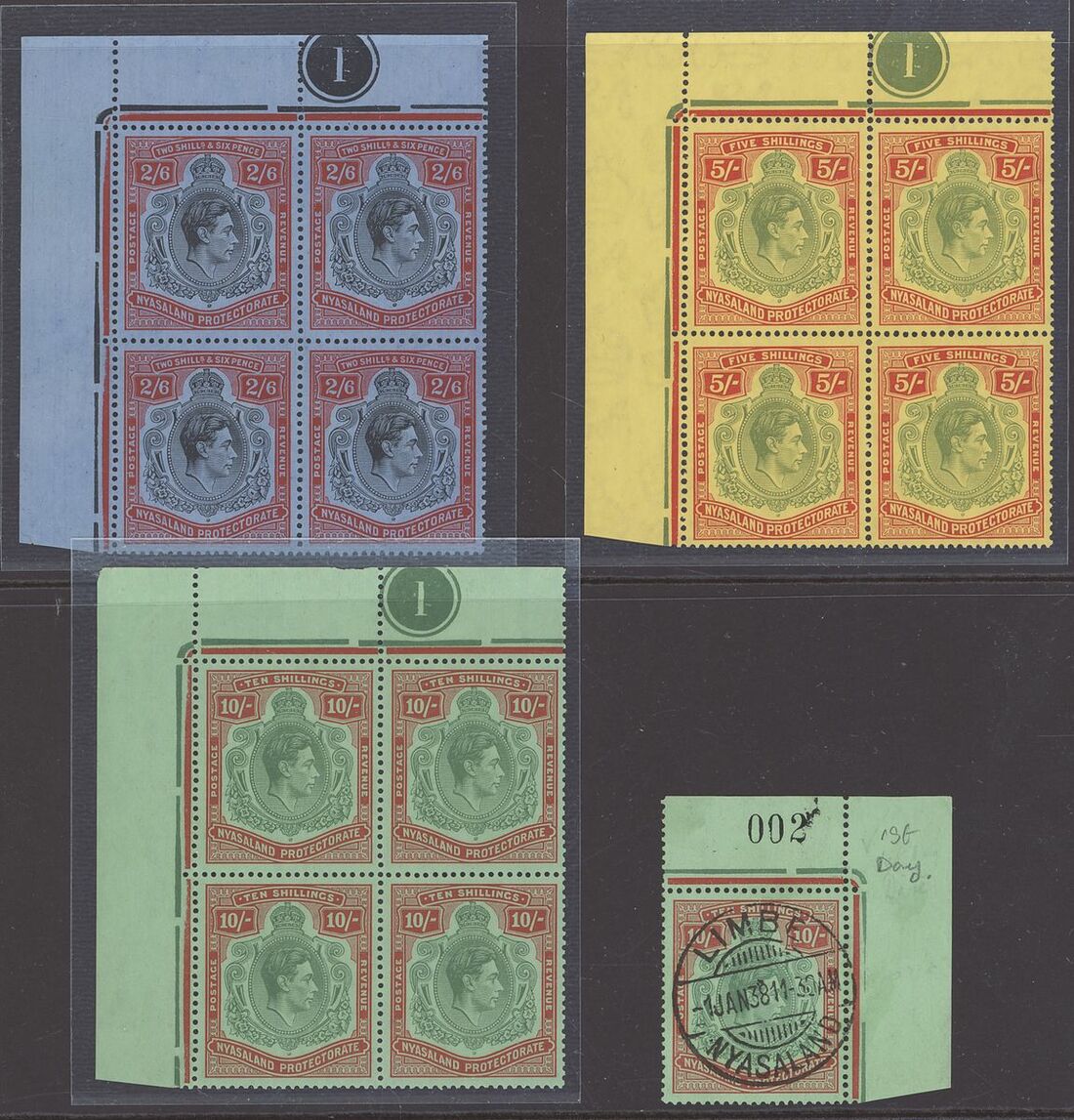 2/6d. black and red on blue, 5/- pale green and red on yellow and 10/- emerald and deep red on pale green, each a top right corner block of four with plate number, fine unmounted mint. Also 10/- emerald and deep red on pale green top right corner example with sheet number, centrally cancelled by Limbe "bridge" type datestamp on day of issue.  S.G. 140-142, £612