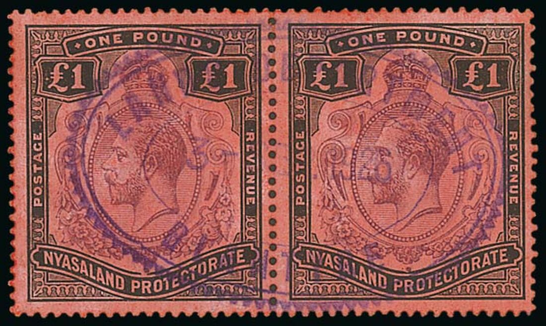 1913-12 MCA £1 purple and black on red, a fiscally used example showing variety serif on