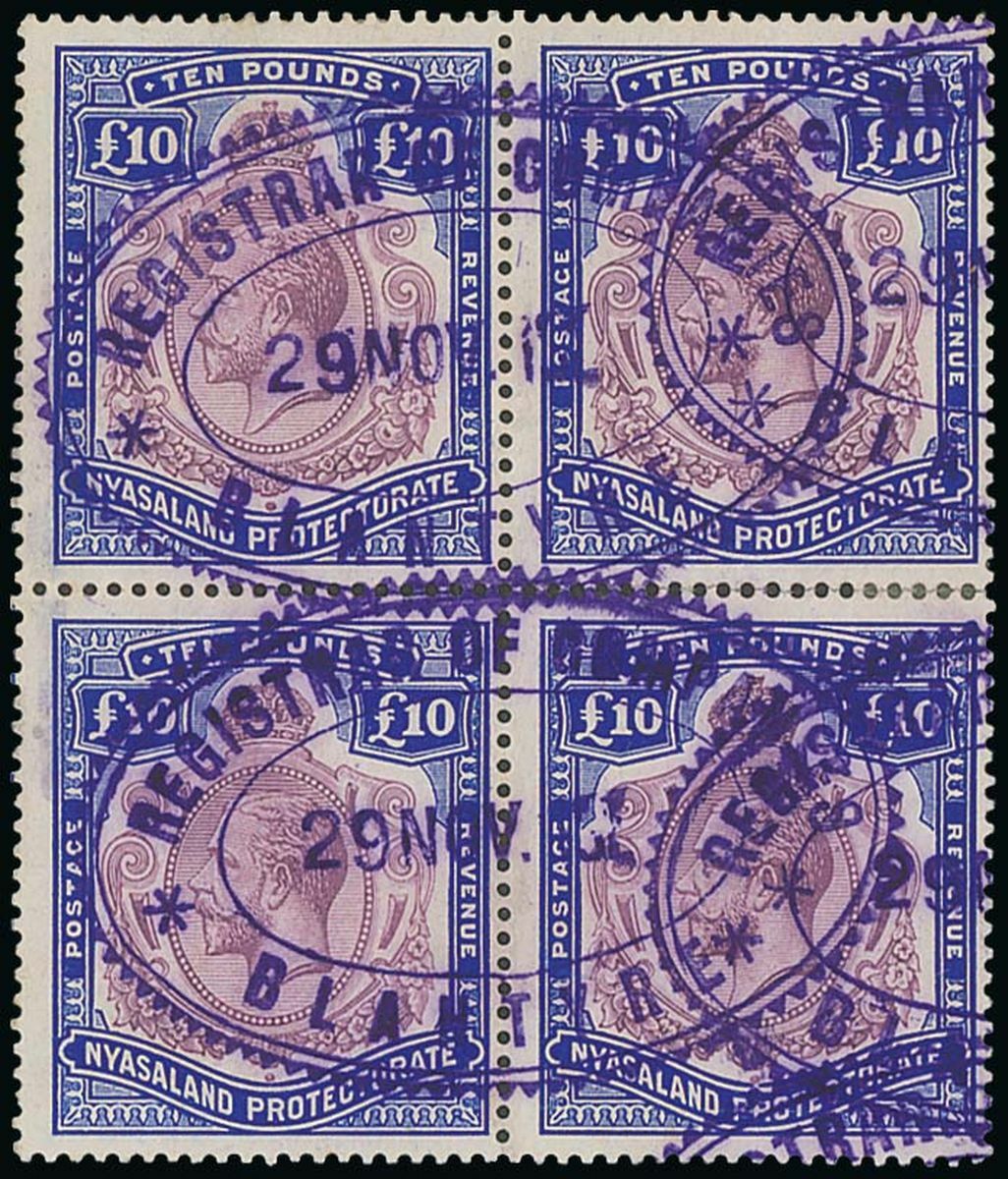 1913-21 MCA £10 purple and royal blue, block of four, fiscally used with parts of five clear strikes of