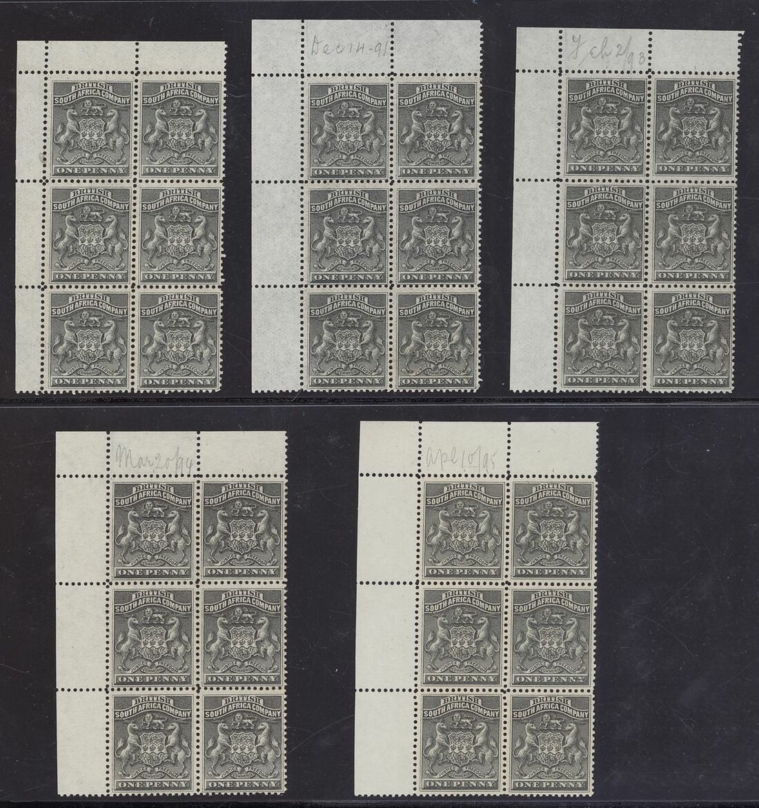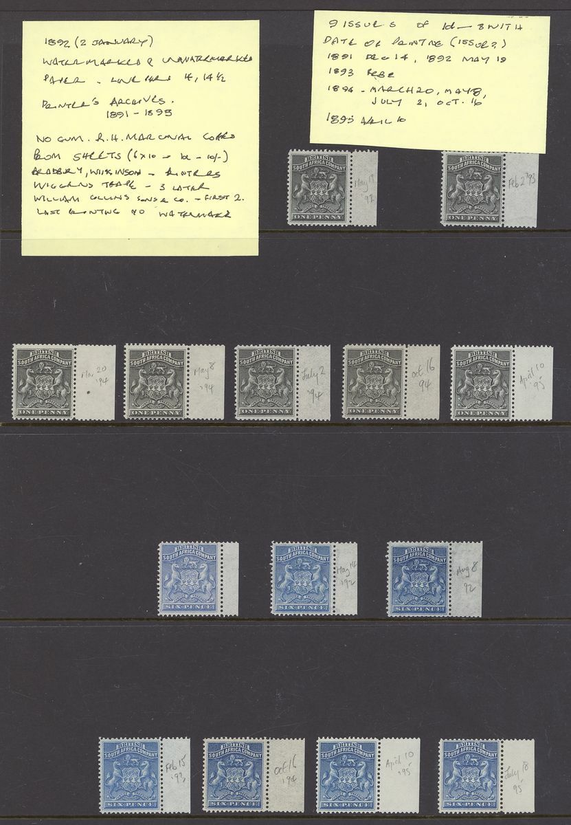 The set from the Printer's Reference book, all annotated with printing dates including a group of marginal examples all from the right of the sheets and comprising 1d. (7), 6d. (7), 1/- (4), 2/- (2), 2/6d. (2), 5/- (2) and 10/- all without gum and also 1d. corner blocks of six (5) all dated and with gum; fine