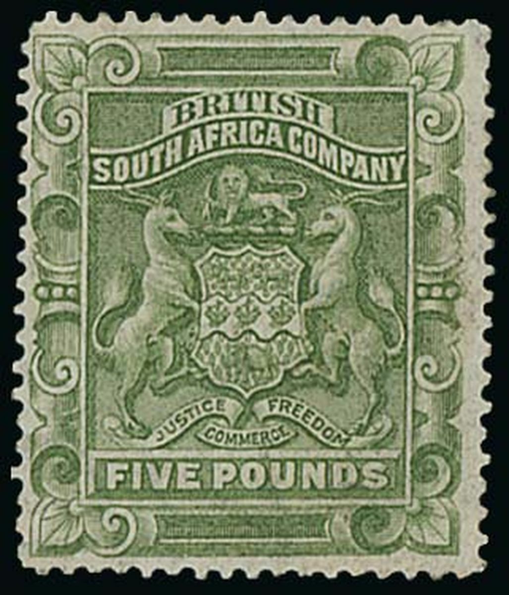 £5 sage-green, large part original gum, a couple of short perfs., still a good example of this scarce high value. S.G. 12, £1,600. Photo