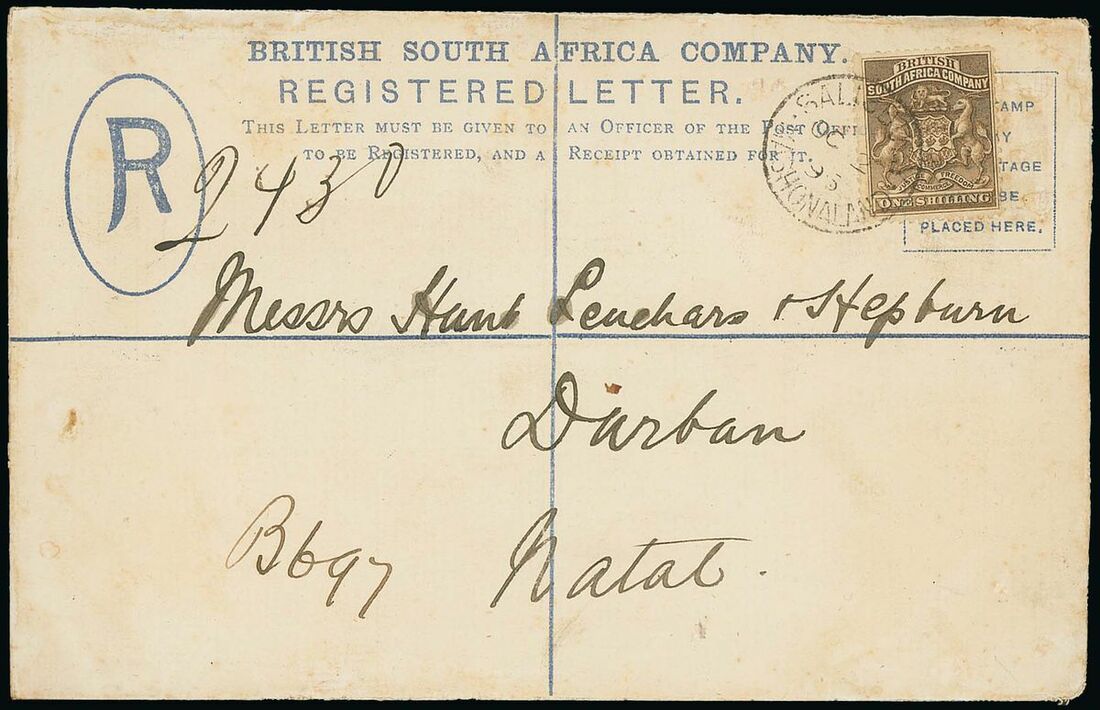 1896 (2 Oct.) envelope registered to Natal bearing 1/- grey-brown tied by