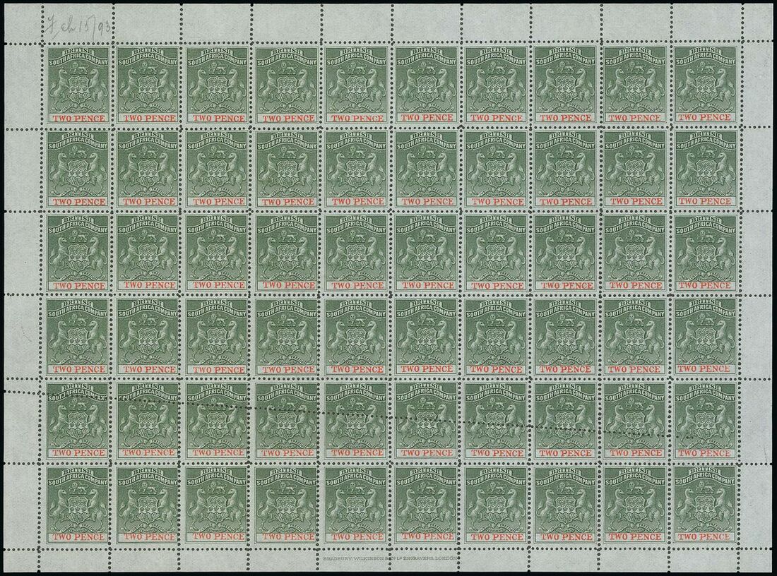 2d. deep dull green and vermilion, fifth printing unique file sheet without gum, dated in pencil in upper left margin Feb 15 93', complete pane of sixty showing dramatic additional row of perforations in row four; the rest of these file sheets were broken up, this sheet presumably kept intact to preserve this spectacular perforation error. Fine. Photo