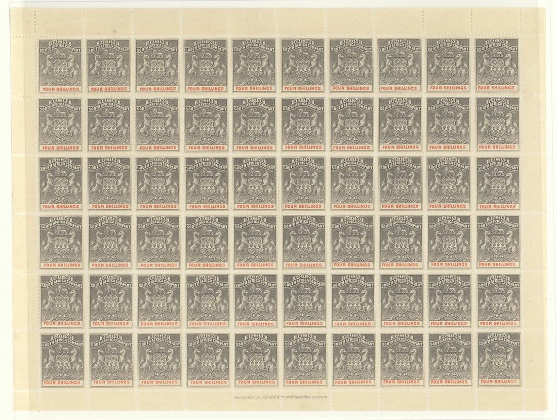 4/- grey-black and vermilion, complete sheet of sixty without watermark and with 'Bradbury Wilkinson' imprint at foot, fine and fresh with full original gum; rare. S.G. 26, £4,800+