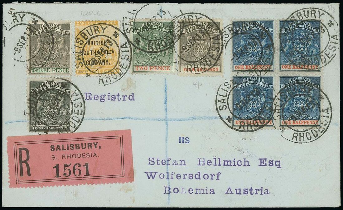 1913 (9 Sept.) philatelic Hellmich envelope registered to Austria bearing 1892-93 1d., 1892-94 ½d. (4), 2d., 3d. and 4/- and 1896 Cape of Good Hope overprinted 1/- all tied by
