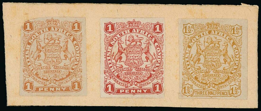 Three stamp sized imperforate proofs of Large Arms for postcards affixed to card (40 x 97mm.) comprising 1d. in orange, 1d. in red and 1½d. in yellow-brown, the 1d. orange slightly cut-into at upper left. Photo